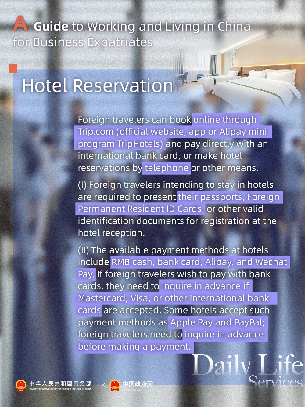 Personal Affairs Employment Residency Permit Stay Permit Visas Certificate of No Criminal Record Immigration and Customs Marriage and Birth Checkpoints Accommodation Pet Dog Services VAT Refunds Enterprise Affairs Establishment and Alteration Annual Inspection Bankruptcy and Cancellation of Registration International Taxation Employment Environmental Protection Cross-border Tax Service for Non-resident Enterprises