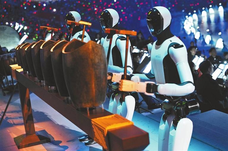Three Walker S2 robots from Shenzhen-based UBTECH beat goudiao, an ancient bronze percussion instrument resembling chime bells, at the opening ceremony of the 15th National Games on the night of November 9.