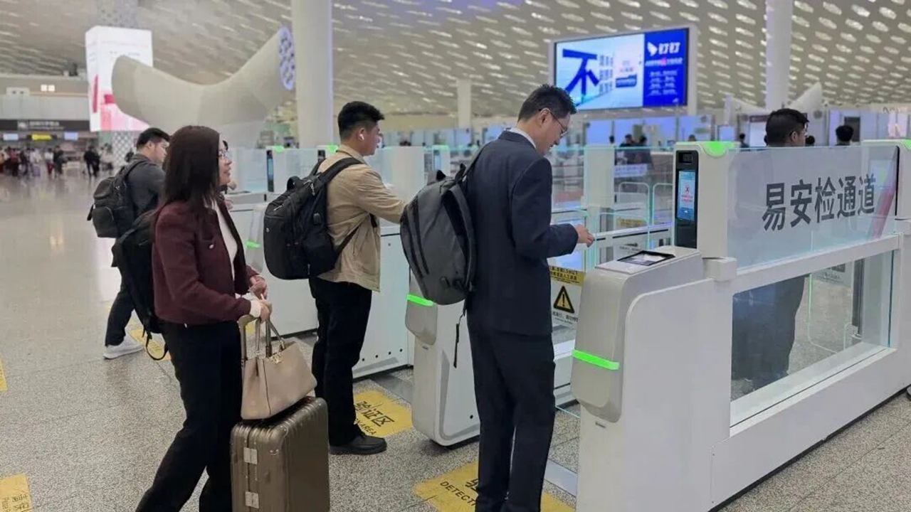 Air travelers line up at a smart security checkpoint at Shenzhen Bao’an International Airport, where technology is helping ease congestion.