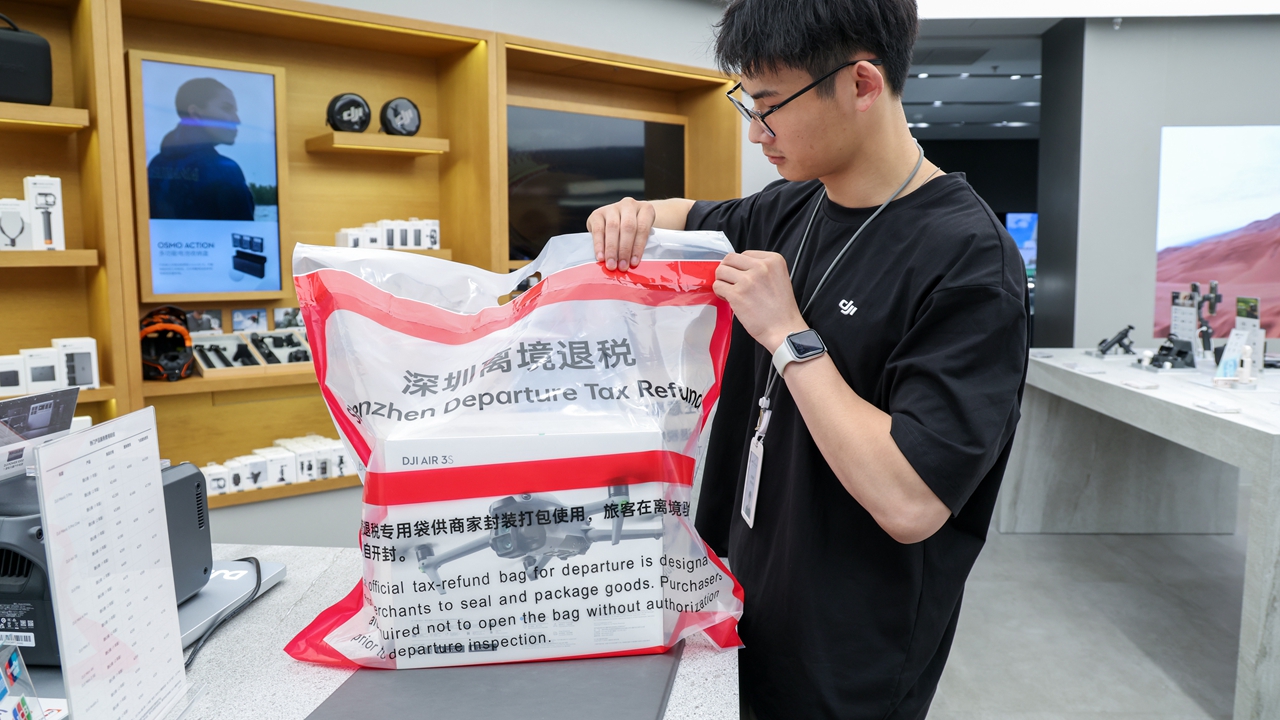 A staff member at the DJI store in The MixC shopping mall in Luohu District packs a shopper’s purchases into a standard tamper-evident pouch in April 2025.