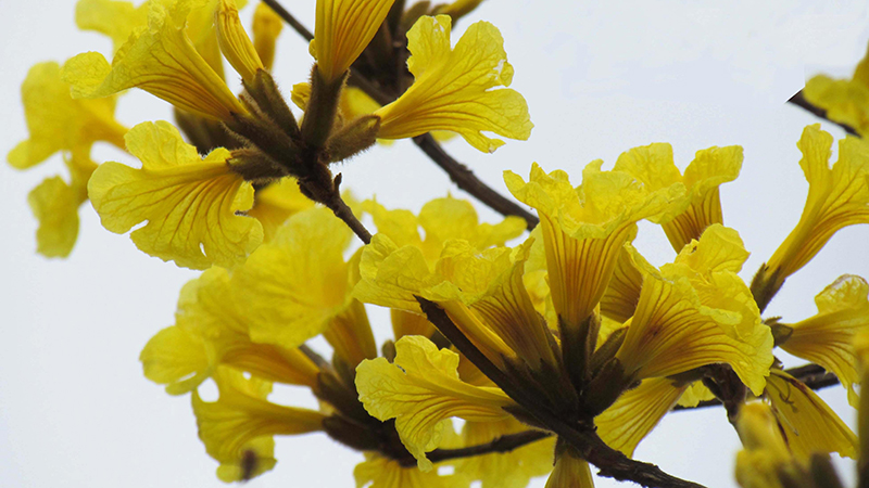 The golden yellow funnel-shaped blossoms of Handroanthus chrysanthus are very eye-catching as they stand out against the clear sky, resembling wind chimes.