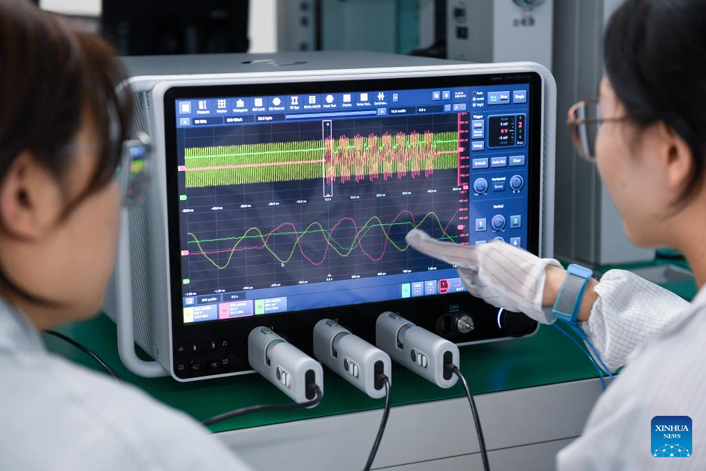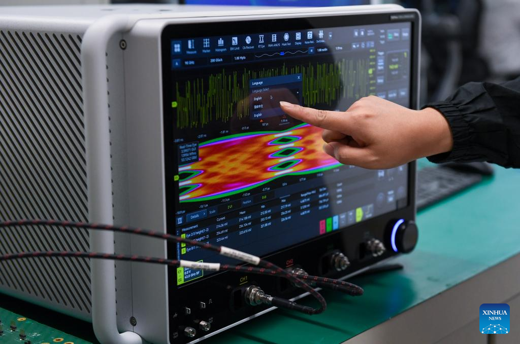 Liu Sang, CEO of Shenzhen Longsight Technologies Co., Ltd, introduces the 90GHz ultra-high-speed real-time oscilloscope in Shenzhen, south China's Guangdong Province, Oct. 15, 2025.
