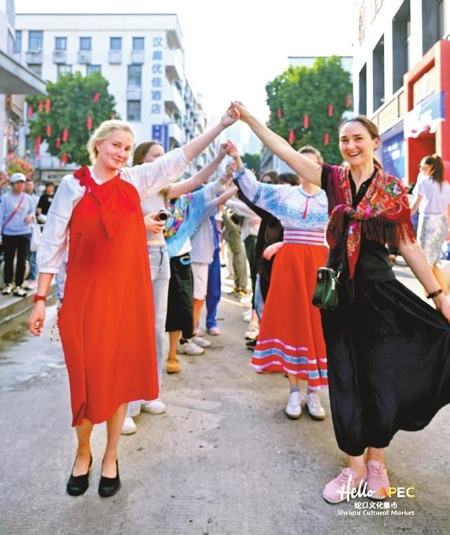 Performers lead visitors in a traditional circle dance during the “Hello APEC · Shekou Cultural Market — Exploring Russia” event in Shekou on March 15. Courtesy of Shekou MSCE