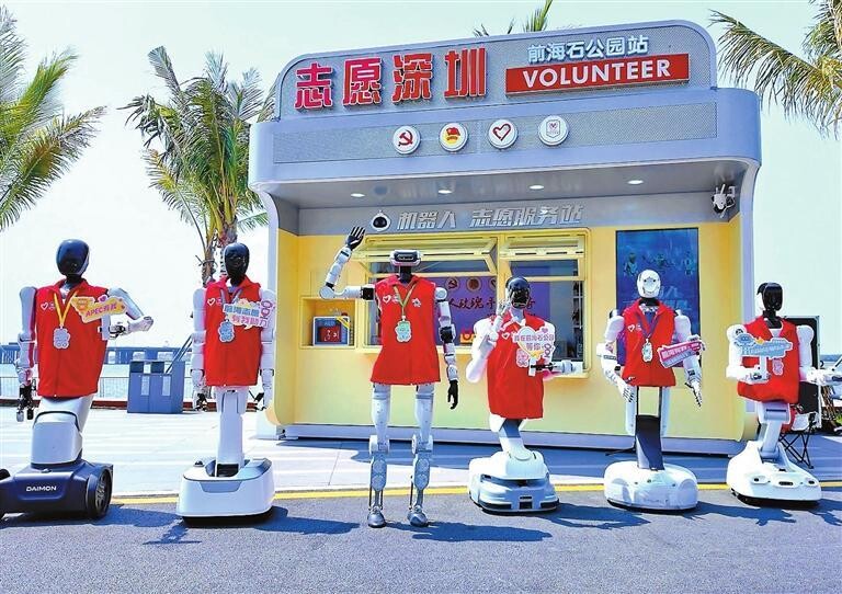 Robots wearing volunteer vests welcome visitors at a volunteer service station in Qianhai Stone Park in Shenzhen. China's first robot volunteer service station became operational at the park on March 20. Developed by local companies, the robots offer eight key services: daily consultations, convenience assistance, patrol reminders, knowledge outreach, policy explanations, emergency support, interactive communication, and entertainment performances.