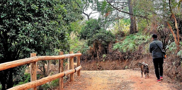A visitor walks his dog along the Luofang Park wild trail, which is Shenzhen’s first systematically designed pet-friendly hiking route.