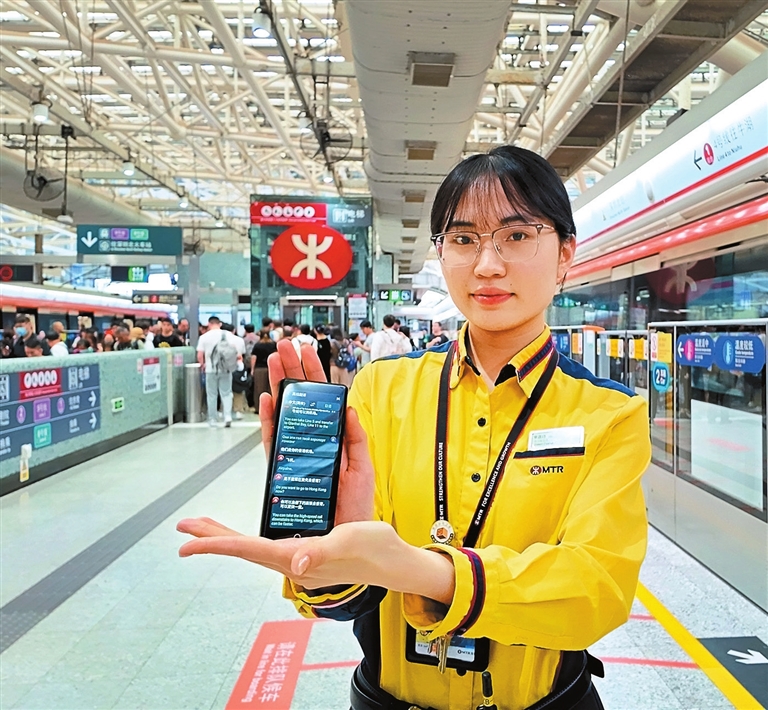 A Shenzhen Metro staffer demonstrates a smart multilingual translator.