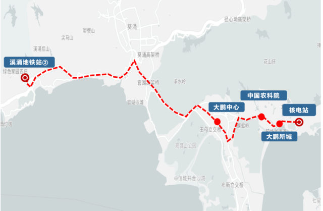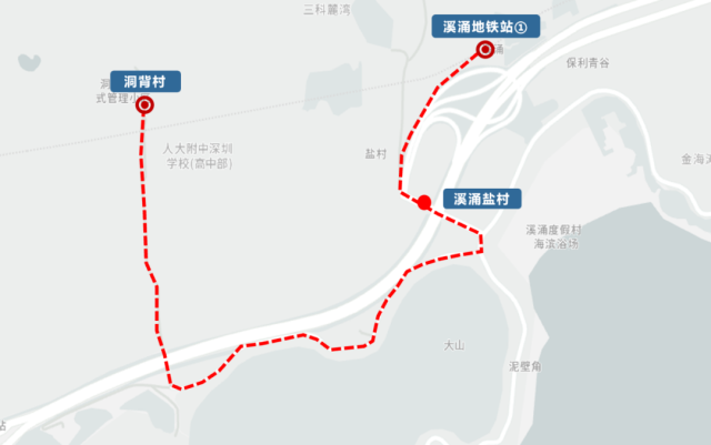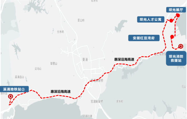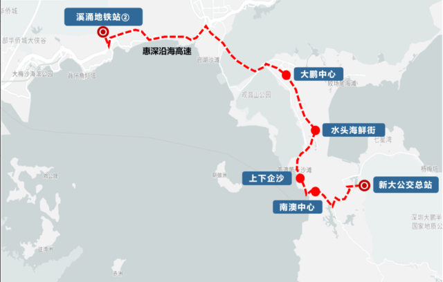 Key Stops: Baguang Exhibition Hall (坝光展厅), Baguang Talent Apartments (坝光人才公寓), Xichong Yancun (溪涌盐村), Xichong Resort (溪涌度假村), Xichong Primary School (溪涌小学).