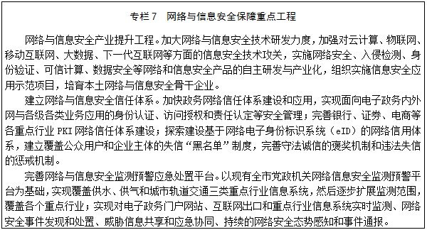 28.加强技术攻关,加快培育信息安全企业。加快网络与信息安全技术攻关,大力发展信息安全服务,重点培育网络与信息安全骨干企业,促进产业链协调发展;加强对云计算、物联网、移动互联网、下一代互联网等方面的信息安全技术研究,推广国产密码等自主信息安全技术应用;出台网络与信息安全产业专项扶持政策,落实有关政府采购政策措施和管理制度,进一步加大支持信息安全产业发展。