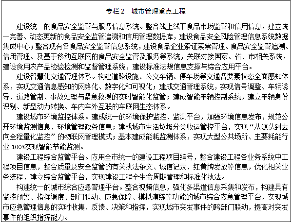 加快实施“宽带中国”战略,建设高速、泛在、融合、便捷的下一代信息传输网络,建成技术先进、结构合理、协调发展、绿色安全的云计算基础设施体系,提高城市基础设施智能化水平。