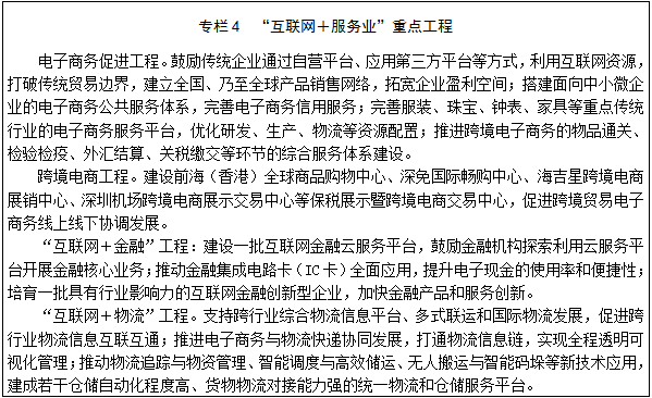 14.促进互联网与服务业创新发展,满足服务对象新需求。促进互联网与银行、证券、保险、基金等金融机构全面融合与创新发展,为大众提供安全、便捷、丰富的金融产品和服务,满足不同层次实体经济的投融资需求;推进互联网和商贸结合,缩短供需距离,强化供需关系,满足网络化消费需求,完善电子商务标准规范和公共服务等支撑环境;实施“互联网+流通”工程,提高物流效率,降低物流成本,促进物流企业和生产企业紧密结合,提升物流自动化和智能化水平。