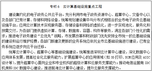 25.统筹推进云计算基础设施建设。加强统筹,按照《深圳市电子政务总体框架》的要求,充分利用深圳电子政务资源中心、超算中心(重点为社会和科技创新服务)、灾备中心的计算和存储资源,建设完善全市统一的政务云服务平台,推进电子政务集约化建设,提高资源利用率;鼓励电信运营商、信息服务提供商推进基于云计算的服务模式,推广低成本、高质量、广覆盖的云服务;支持各类企业利用公共云计算服务资源开展相关业务。