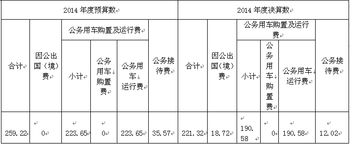 注:2014年度预算数为“三公”经费年初预算数,决算数是包括当年财政拨款预算和以前年度结转结余资金安排的实际支出。2014年因公出国(境)预算数0万元。是因为为进一步规范因公出国(境)经费管理,我市因公出国(境)经费完全按零基预算的原则根据市因公出国计划预审会议审定计划动态调配使用,因此各单位2014年因公出国(境)经费预算数为零,在实际执行中根据计划据实调配。2014年我局实际因公出国(境)费用为18.72万元。