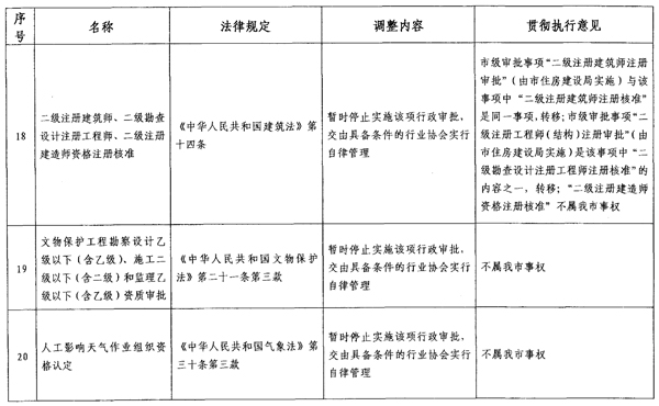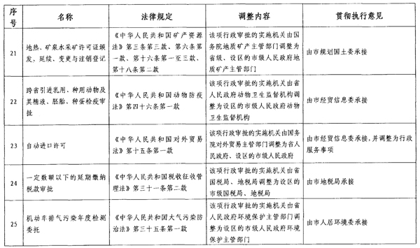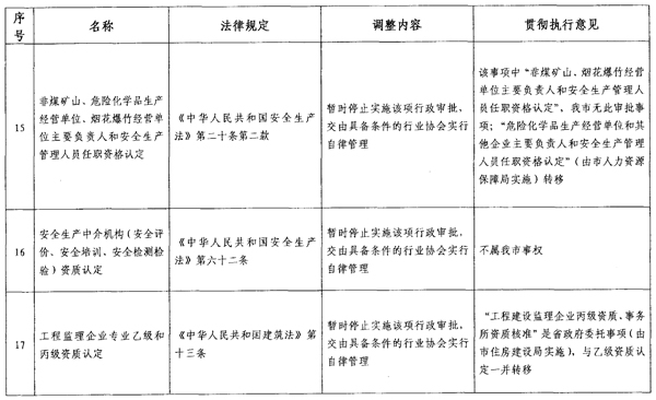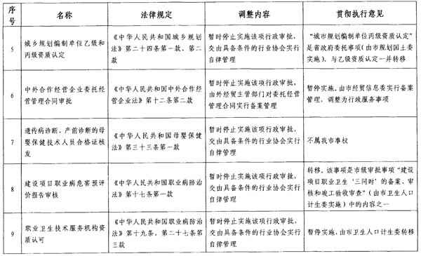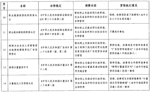 根据省政府通知要求,各区政府、新区管委会,市政府直属各单位要继续推进行政审批制度改革工作,确保改革事项的落实。对暂时停止实施的事项,原实施机关应当立即停止实施。对政府部门暂时不再实施,转移给社会组织实行自律管理的事项,各转出部门要就每项转移事项制度实施方案,尽快交由社会组织承接,最迟不得晚于2013年6月底前完成。对新承接事项,各部门要主动与上级部门做好沟通衔接,争取尽快完成交接工作。