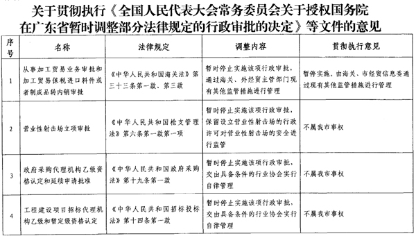 为贯彻落实《全国人民代表大会常务委员会关于授权国务院在广东省暂时调整部分法律规定的行政审批的决定》,《国务院关于执行<全国人民代表大会常务委员会关于授权国务院在广东省暂时调整部分法律规定的行政审批的决定>的通知》(国函〔2013〕9号)、《广东省人民政府转发国务院关于执行<全国人民代表大会常务委员会关于授权国务院在广东省暂时调整部分法律规定的行政审批的决定>的通知》(粤府函〔2013〕35号),特提出以下意见,请遵照执行。
