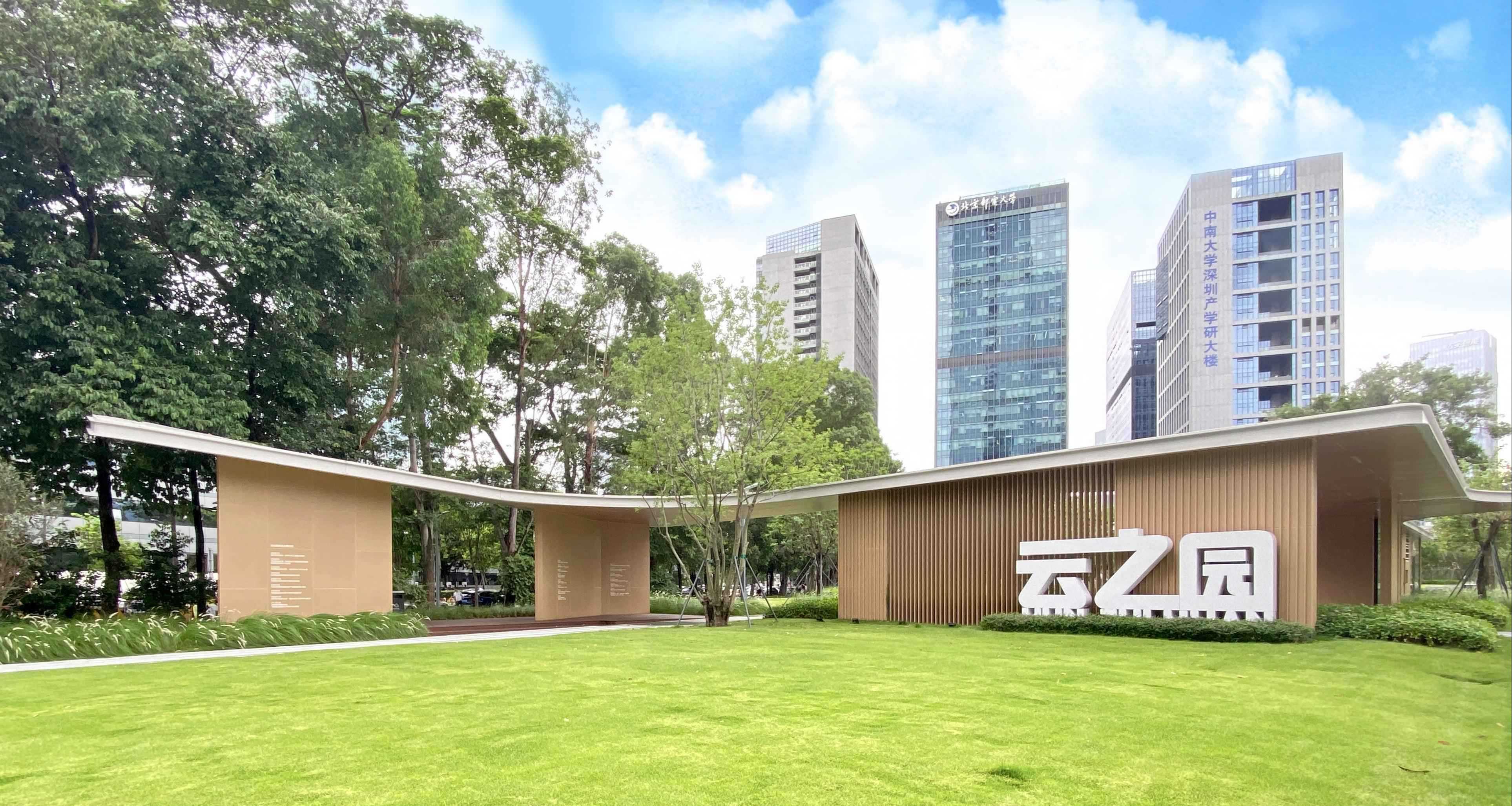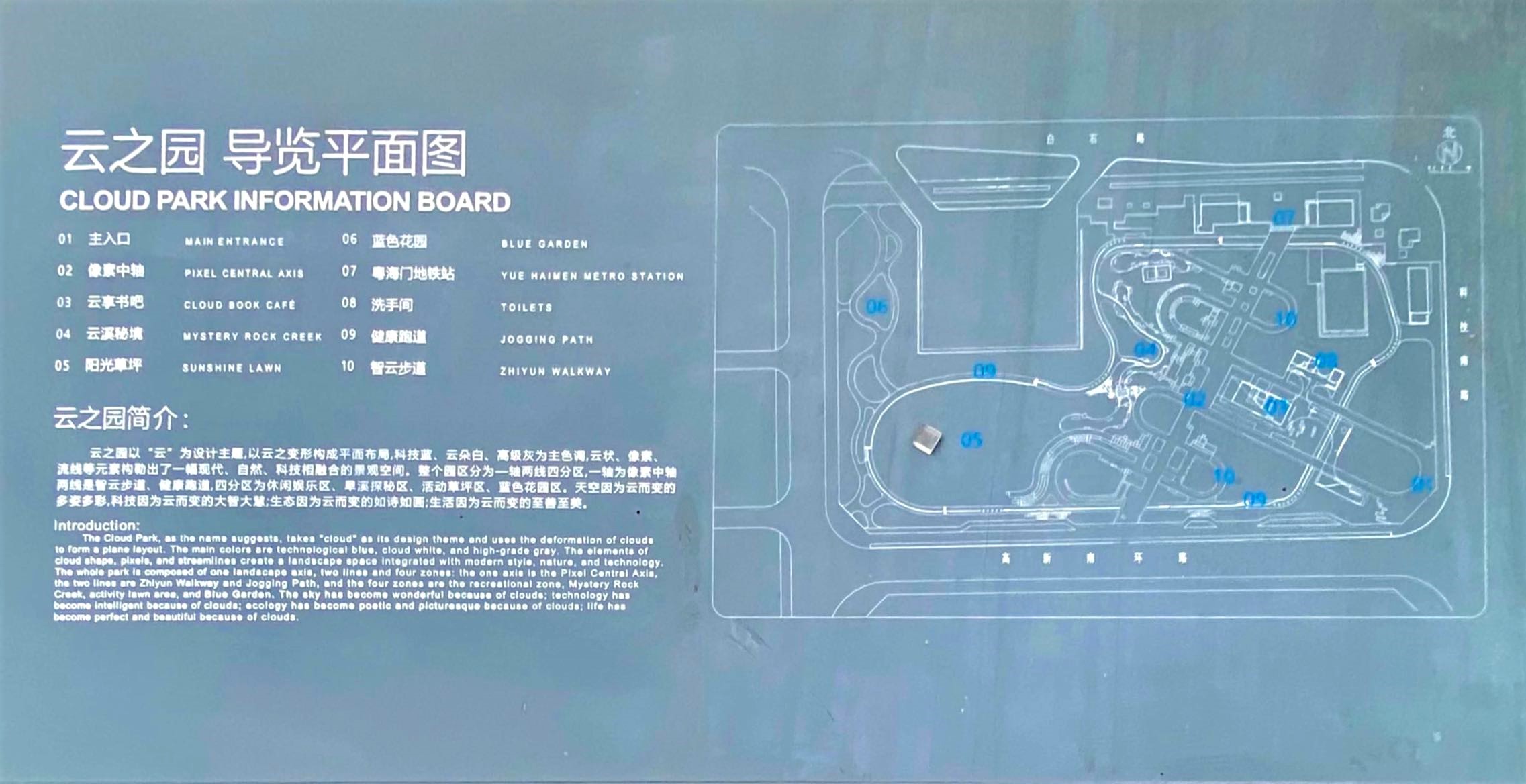 云之园以“云”为设计主题,以云之变形构成平面布局,科技蓝、云朵白、高级灰为主色调,云状、像素、流线等元素构勒出了一幅现代、自然、科技相融合的景观空间。整个园区分为一轴两线四分区,一轴为像素中轴,两线是智云步道、健康跑道,四分区为休闲娱乐区、早溪探秘区、活动草坪区、蓝色花园区。天空因为云而变得多姿多影,科技因为云而变得大智大慧;生态因为云而变得如诗如面:生活因为云而变得至善至美。
