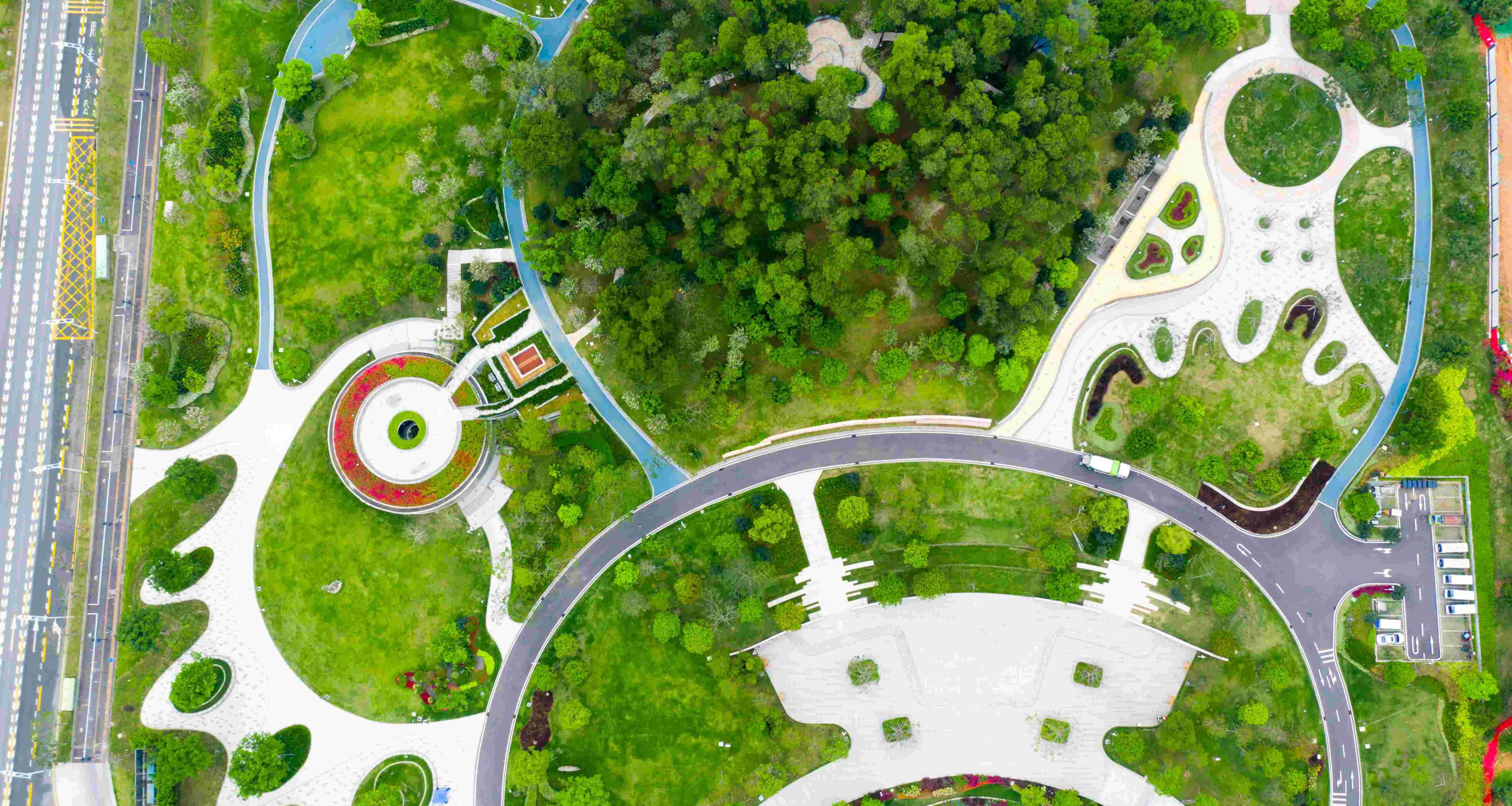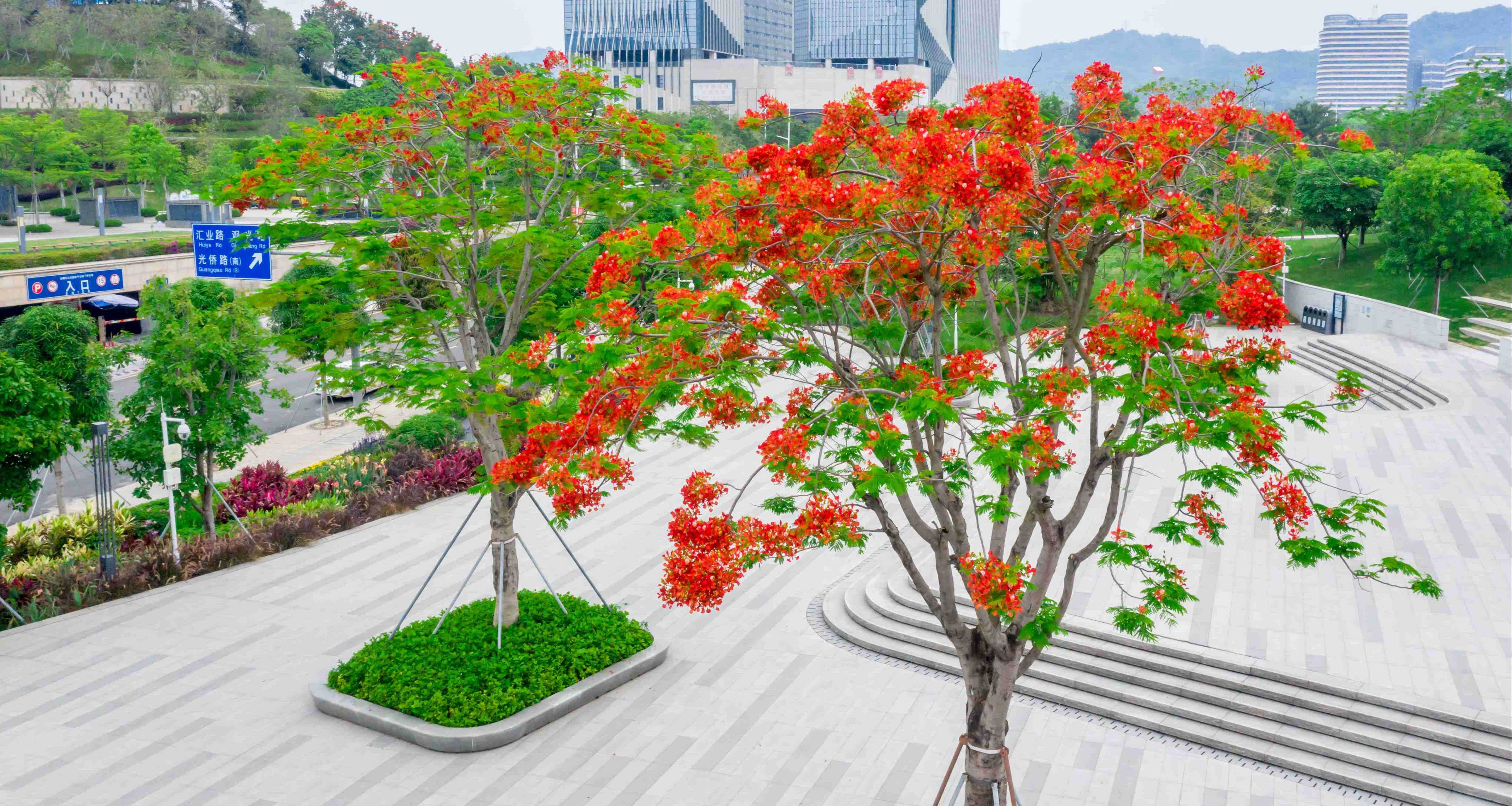 绿化风格简约、现代,以原有绿化乔木为基底,尽可能的保护、利用山体原生乔木;祥云广场以丛生朴树为主,采用乔木+ 草坪、花卉的配置形式,营造舒朗通透的空间氛围,主入口广场、西侧科普文化广场则以香樟、秋枫等常绿树种为背景,片植凤凰木等开花树种,打造壮丽的花海景观。