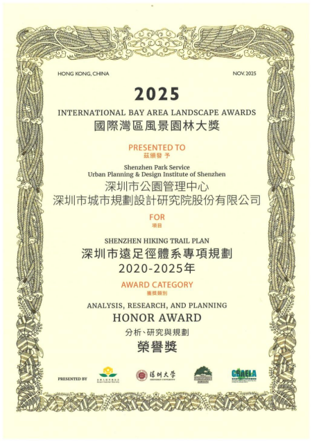 由深圳市城市管理和综合执法局指导,深圳市公园管理中心组织,深圳市城市规划设计研究院股份有限公司编制的《深圳市远足径体系专项规划(2020-2025年)》项目,在“2025国际湾区风景园林大奖——分析、研究与规划”类别中获荣誉奖。