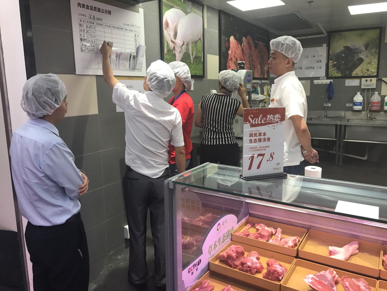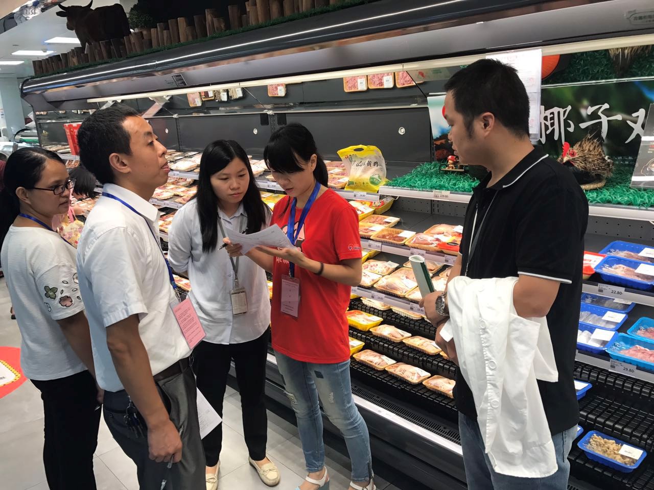 深圳市零售商业行业协会和深圳市食品安全促进会在全国首创“企业间循环不互评”评审模式(由各企业食品管控岗工作人员作为评审员按照统一标准评审),从2011年起,连续七年12次开展“深圳市食品安全规范管理店”创建工作。目前全市5千平方米以上的282家大型超市中有138家获得“深圳市食品安全规范管理店”称号。图一为2017年7月6日评审员在深南天虹店检查肉类检验合格证明的公示情况。图二为2017年7月6日评审员在天虹坪山店检查散装食品标识。