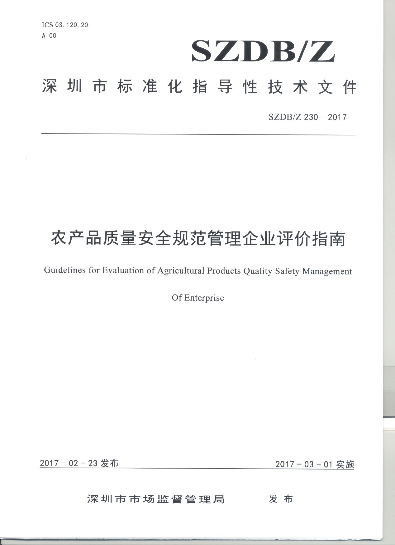 2017年2月,由深圳市农业产业化龙头企业协会牵头编制的《农产品质量安全规范管理企业评价指南》发布实施,这是深圳市食品质量安全规范管理方面的第一个深圳标准,夯实了农业企业食品质量安全基础。
