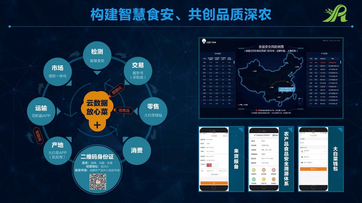 深圳市农产品股份有限公司开发的“智慧食安”平台系统,打通产地、运输、市场、检测、交易等农产品主要流通环节。通过“大白菜+APP”等信息手段进行批发市场运作全程数据监控;引入第三方检测机构检测数据,实现检测结果随时可查;通过食品安全追溯二维码、风险预警图等大数据应用,实现从源头到餐桌全流程可追溯。
