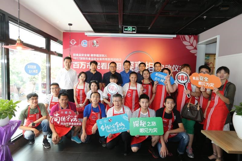 2017年7月1日,“百万市民看后厨,探真相”活动在肯德基华强北餐厅正式拉开序幕,市食品药品监管局副局长李忠(后排左四)、食品药品安全总监单友亮(后排左二)出席启动仪式。百胜餐饮(深圳)有限公司积极参与,接受市民监督,开放100多家肯德基餐厅后厨,邀请市民零距离观看食品生产过程。本次活动持续开展,受到广泛关注,被评为2017年深圳市食品安全宣传周市民最喜爱的活动第一名,电视、报纸、网络、微信等媒体全渠道报道共计99篇。