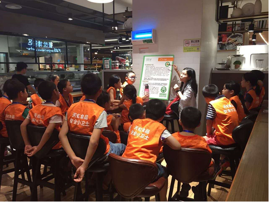 2017年7月1日-7月30日,天虹商场股份有限公司举办食品安全小卫士系列活动160场,包括“食品安全科普大讲堂暨小卫士特训班开班仪式”“我是果蔬农残实验室检测员”“我是健康食品代言人”“我是小小质检员和食品安全小卫士毕业典礼”等。通过旨在让家长和小朋友一起深入了解天虹食品安全质量把控相关工作,学习食品安全知识。图为天虹邀请小朋友到超市现场学习并体验质检员工作。