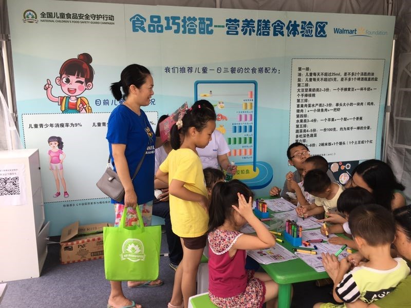 沃尔玛资助中国儿童少年基金会“儿童食品安全移动体验营活动”,制作儿童食品安全宣传画册、VR虚拟厨房、食品搭配一体机等宣传材料,以生动活泼、高科技的形式向儿童宣传食品安全小知识。图为2017年6月3日,沃尔玛带领30多名员工志愿者在深圳华富社区开展儿童食品安全移动体验营活动。