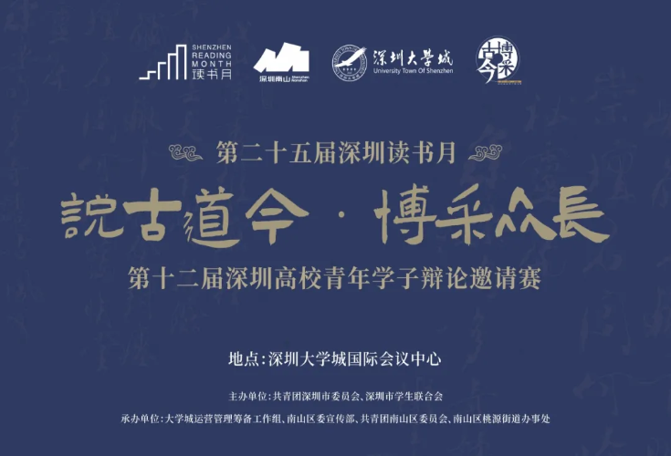 第二十五届深圳读书月“说古道今•博采众长”,第十二届深圳高校青年学子辩论邀请赛总决赛,将于本周六12月7日在深圳大学城国际会议中心204举办共同期待四强队伍献上的思辨盛宴。