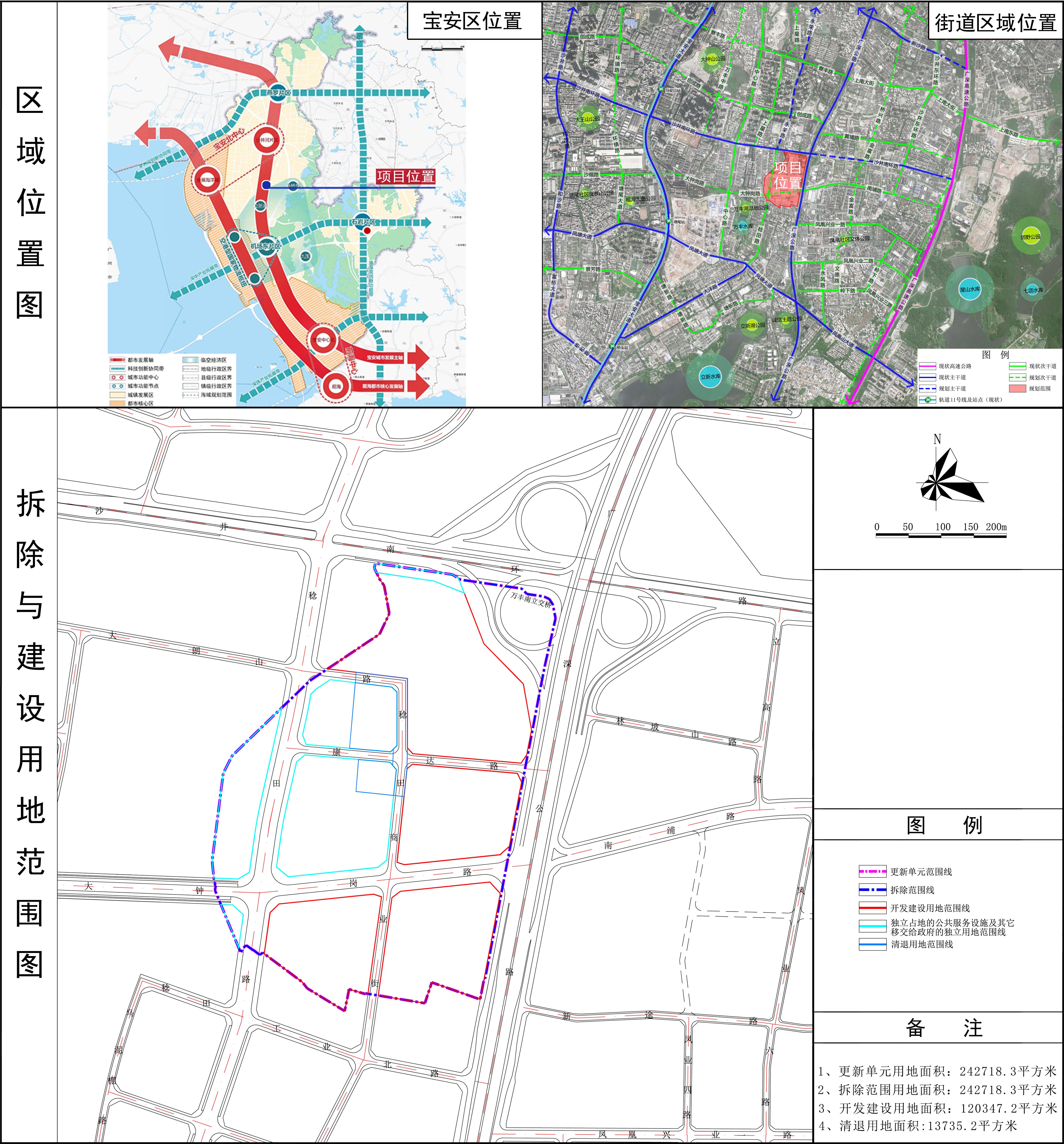 项目位于深圳市宝安区新桥街道广深公路与沙井南环路交会处西南侧,更新单元用地面积242718.3平方米,拆除用地面积242718.3平方米,开发建设用地面积120347.2平方米,规划容积为397470平方米(其中住宅367500平方米,商业7500平方米),公共配套设施建筑面积22470平方米(含18班幼儿园<2所>12400平方米、占地面积10800平方米,托育机构770平方米,社区菜市场1000平方米,社区管理用房300平方米,社区警务室100平方米,便民服务站400平方米,社区健康服务中心1400平方米,社区老年人日间照料中心1500平方米,社区级公共配套用房2400平方米,文化活动室1000平方米,邮政所100平方米,公共充电站1100平方米)。另配建社区体育活动场地2处,占地面积共计3170平方米,社区儿童游戏场地4处,占地面积共计3000平方米,公共停车位100个。物业服务用房按照《深圳经济特区物业管理条例》予以核定,不纳入公共配套设施。