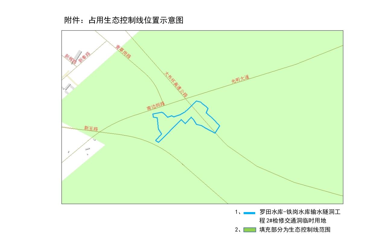 深圳市水务工程建设管理中心申请的罗田水库-铁岗水库输水隧洞工程2#检修交通洞临时用地位于新桥街道,该临时用地拟作为罗田水库-铁岗水库输水隧洞工程2#检修交通洞临时钢筋加工厂、材料堆放、临时便道等使用,用地面积为19866.21平方米,全部位于基本生态控制线内。