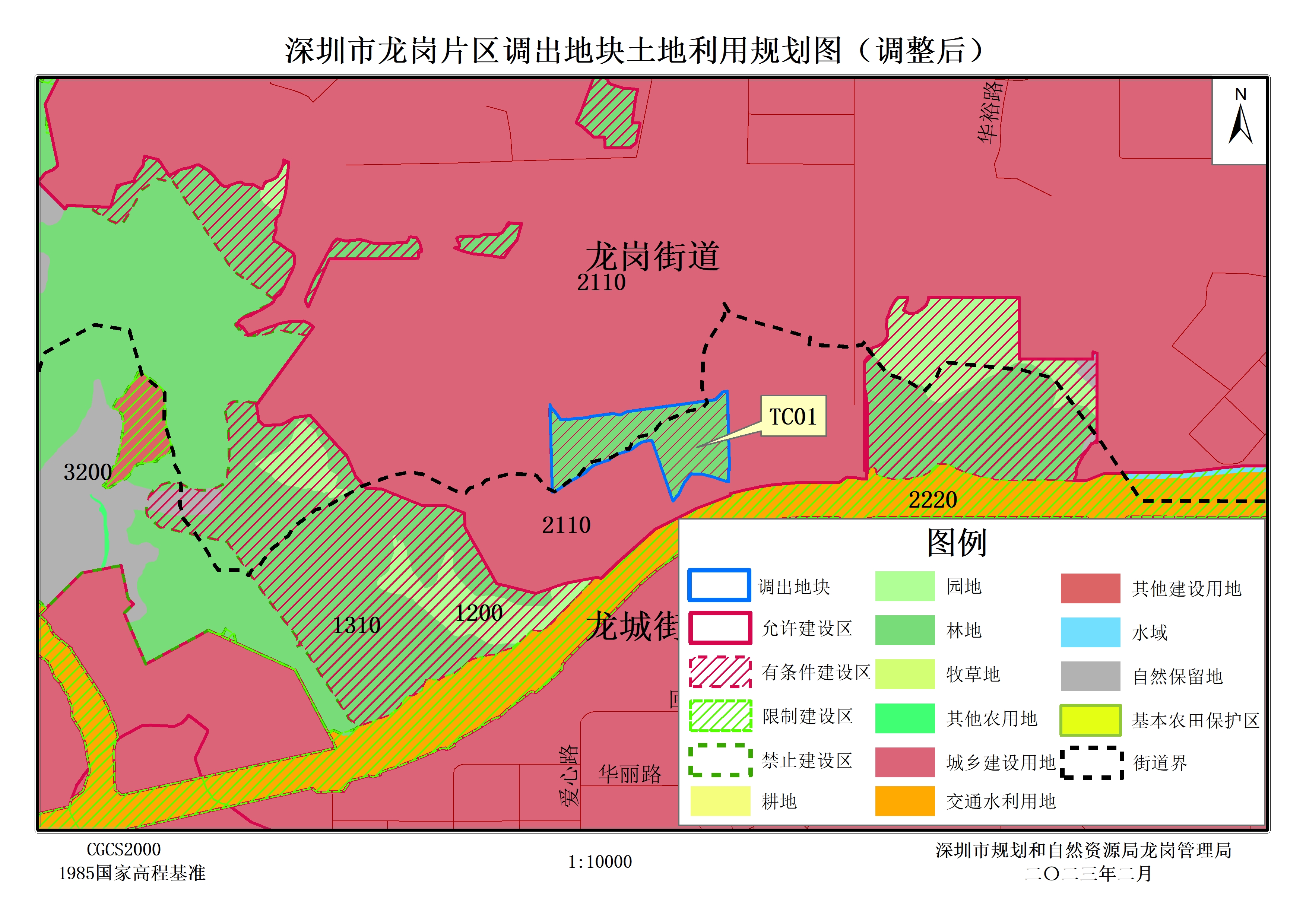 二、调出地块共1块,面积55743.54平方米,调出地块01(TC01)位于龙城街道回龙铺社区和龙岗街道五联社区交界处,盐龙大道北侧,调出地块在土地管制分区中均为允许建设区。经核查《2020年变更调查同口径数据库(政务版)》,调出地块01(TC01)土地利用现状用途为农用地和未利用地;调出地块不涉及耕地和基本农田保护区。经实地调研,调出地块01(TC01)现状为山林地。经核查《深圳市龙岗中心组团分区规划(2005-2020年)(龙城、龙岗、坪地)》,调出地块01(TC01)规划用地性质为林地(E4)。经核查深圳市历年农用地转用方案、农用地转用实施方案和确权用地等,调出地块未经批准为建设用地,未见出让等相关用地手续。经核查,调出地块01(TC01)不涉及全市用地方案图和规划选址。因此,调出地块符合规划调整要求亦同时符合城市规划,可作为调出地块使用。