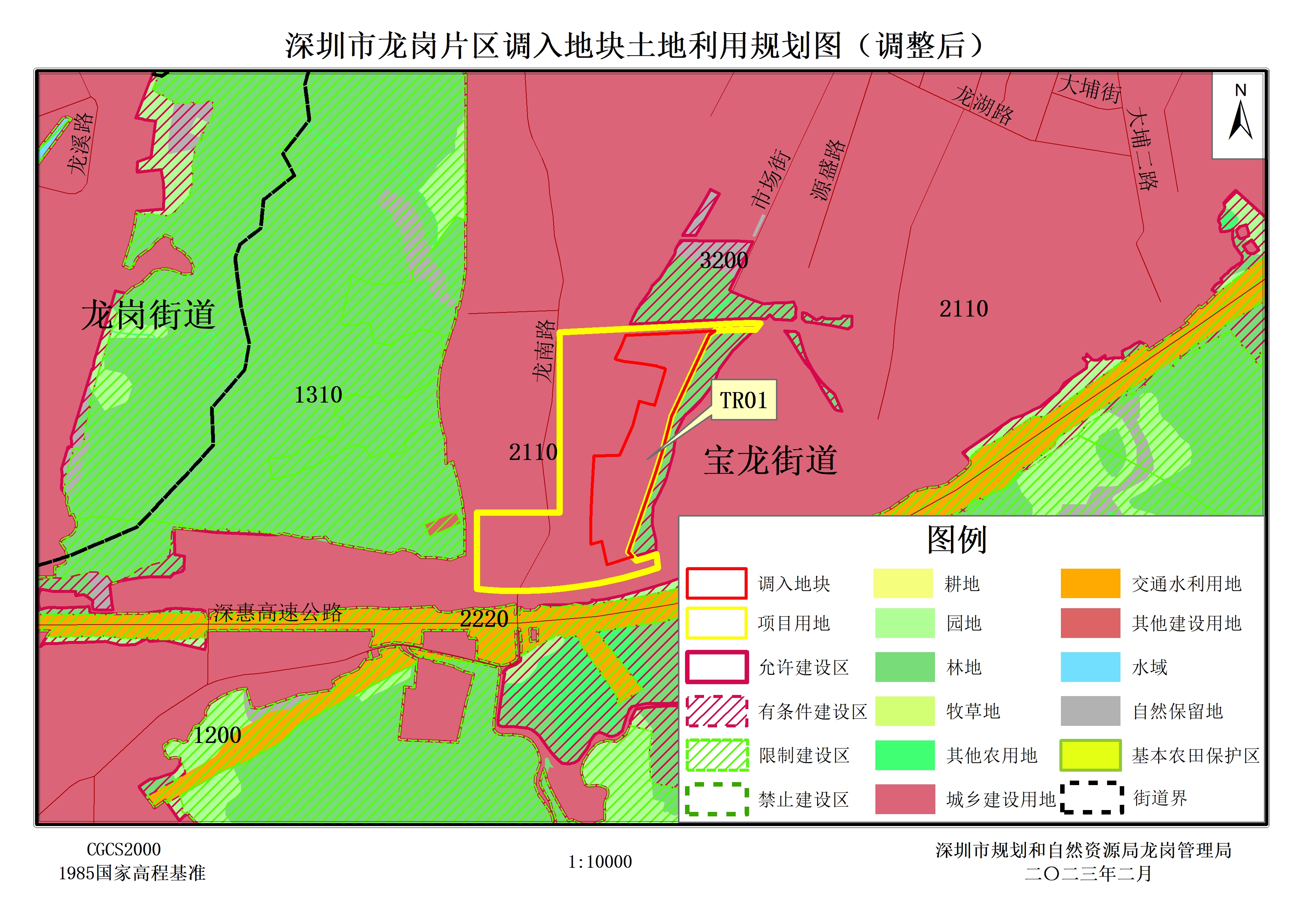 [龙岗大埔片区]法定图则05-03、05-04地块及规划道路位于龙岗区宝龙街道龙东社区,经核《深圳市土地利用总体规划(2006-2020年)》,项目用地涉及有条件建设区55743.54平方米,与土地利用总体规划不符,需开展土地利用总体规划调整工作。为落实项目用地,深圳市规划和自然资源局龙岗管理局编制了《深圳市龙岗片区土地利用总体规划(2010-2020年)有条件建设区使用方案([龙岗大埔片区]法定图则05-03、05-04地块及规划道路)》,方案已于2023年2月15日深圳市规划和自然资源局龙岗管理局第3次局长办公会审批通过。根据公开、公平、公正原则,现将该方案及有关事项进行公告如下: