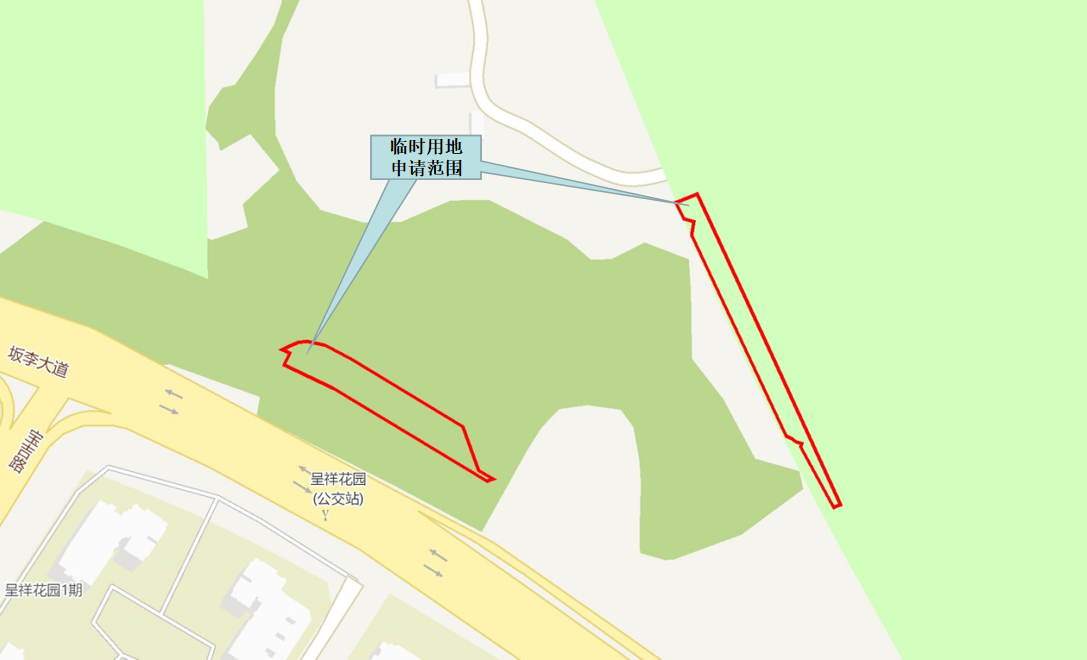 深圳工业软件园项目拟申请临时用地位于龙岗区坂田街道坂澜大道西侧和坂李大道北侧,使用单位为深圳市龙岗区城投高新技术产业投资开发有限公司,临时用地面积为2788.11平方米。