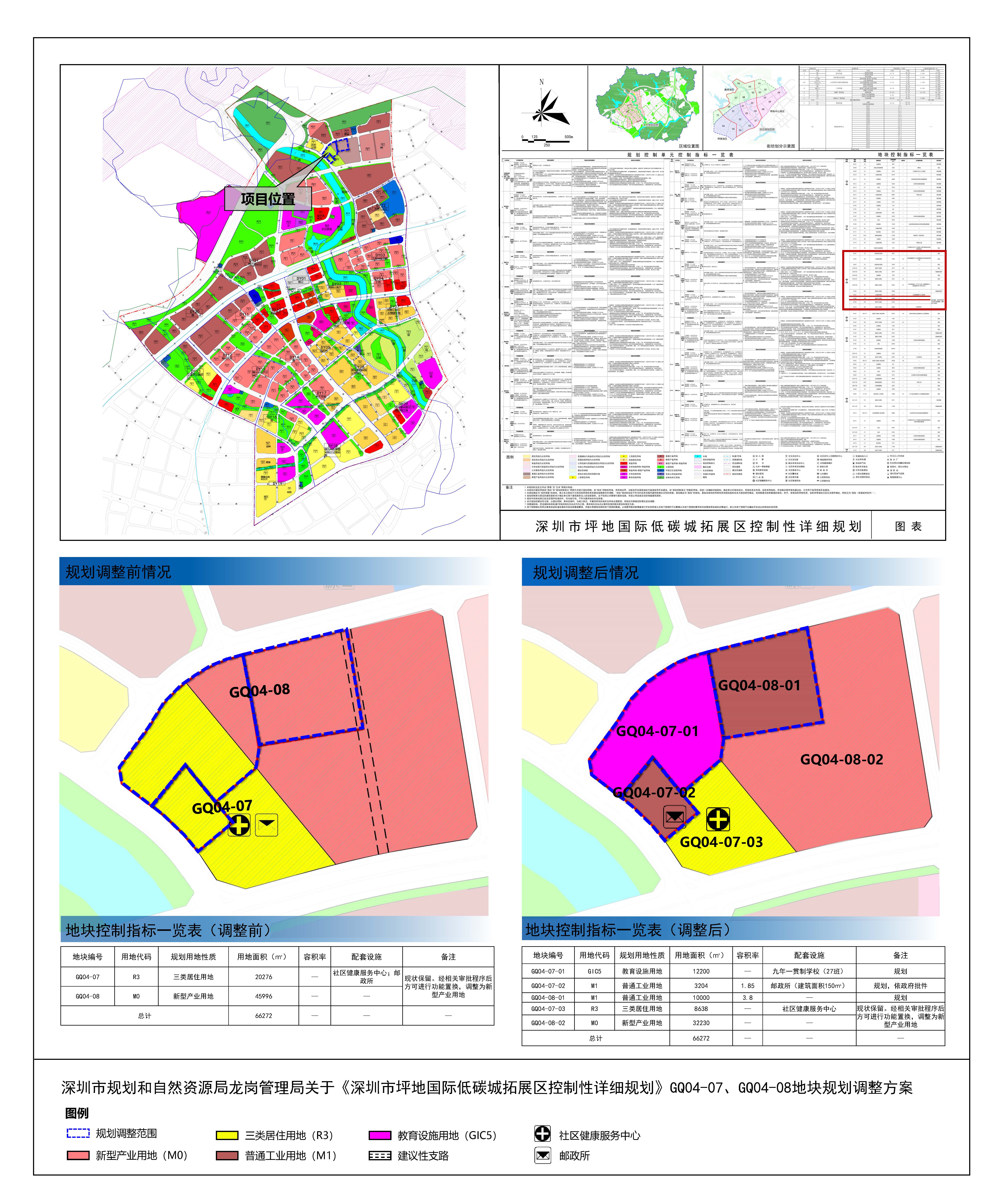 《深圳市坪地国际低碳城拓展区控制性详细规划》于2014年12月批复,规划调整地块位于控制性详细规划高桥04街坊,涉及GQ04-07、GQ04-08两个地块,其中GQ04-07 地块规划用地性质为三类居住用地(R3),用地面积为20276平方米,容积率“—”,配套设施项目名称“社区健康服务中心、邮政所”,备注“现状保留。经相关审批程序后方可进行功能置换,调整为新型产业用地”。GQ04-08地块规划用地性质为新型产业用地(M0),用地面积为45996平方米,容积率“—”,配套设施项目名称“—”,备注“现状保留。经相关审批程序后方可进行功能置换,调整为新型产业用地”,地块内涉及10米宽建议性支路。