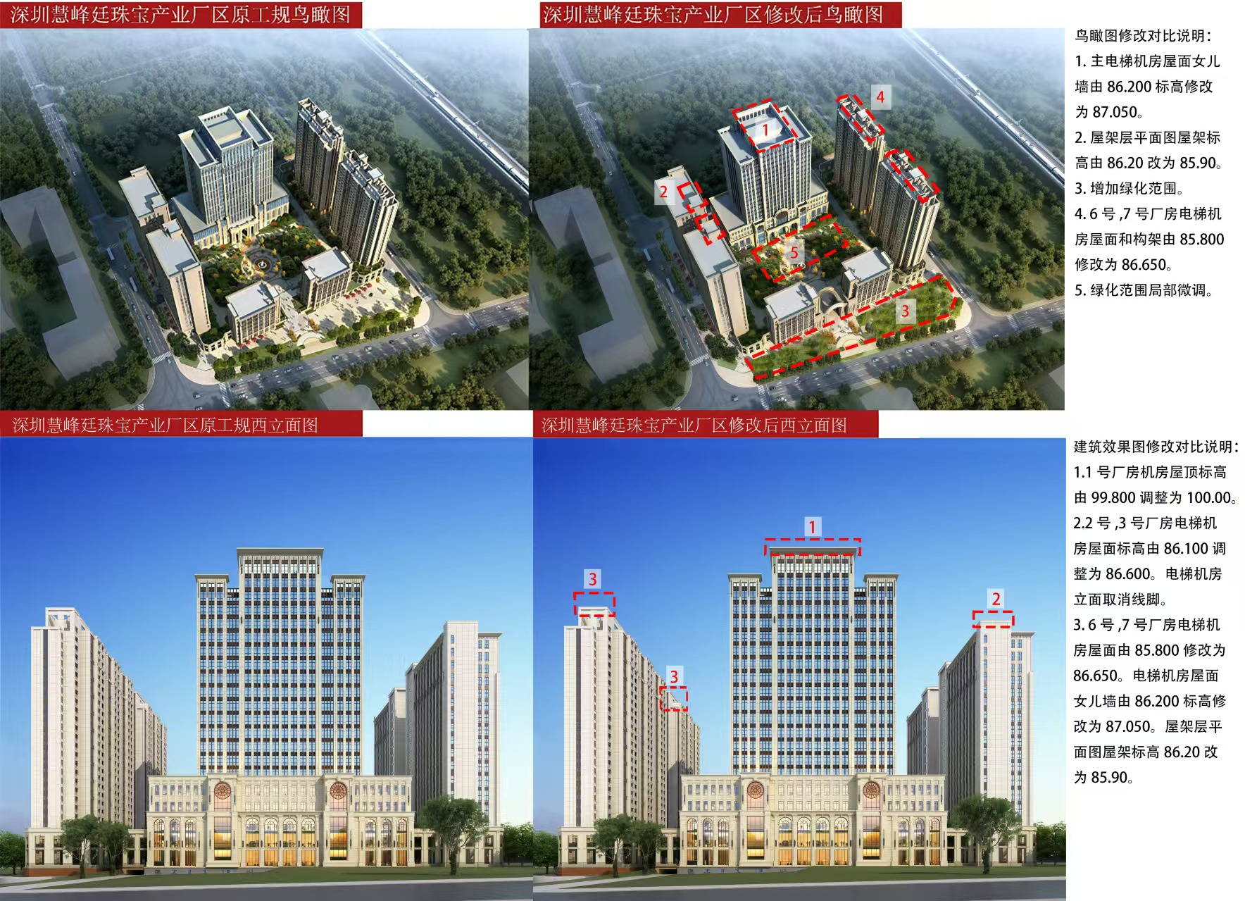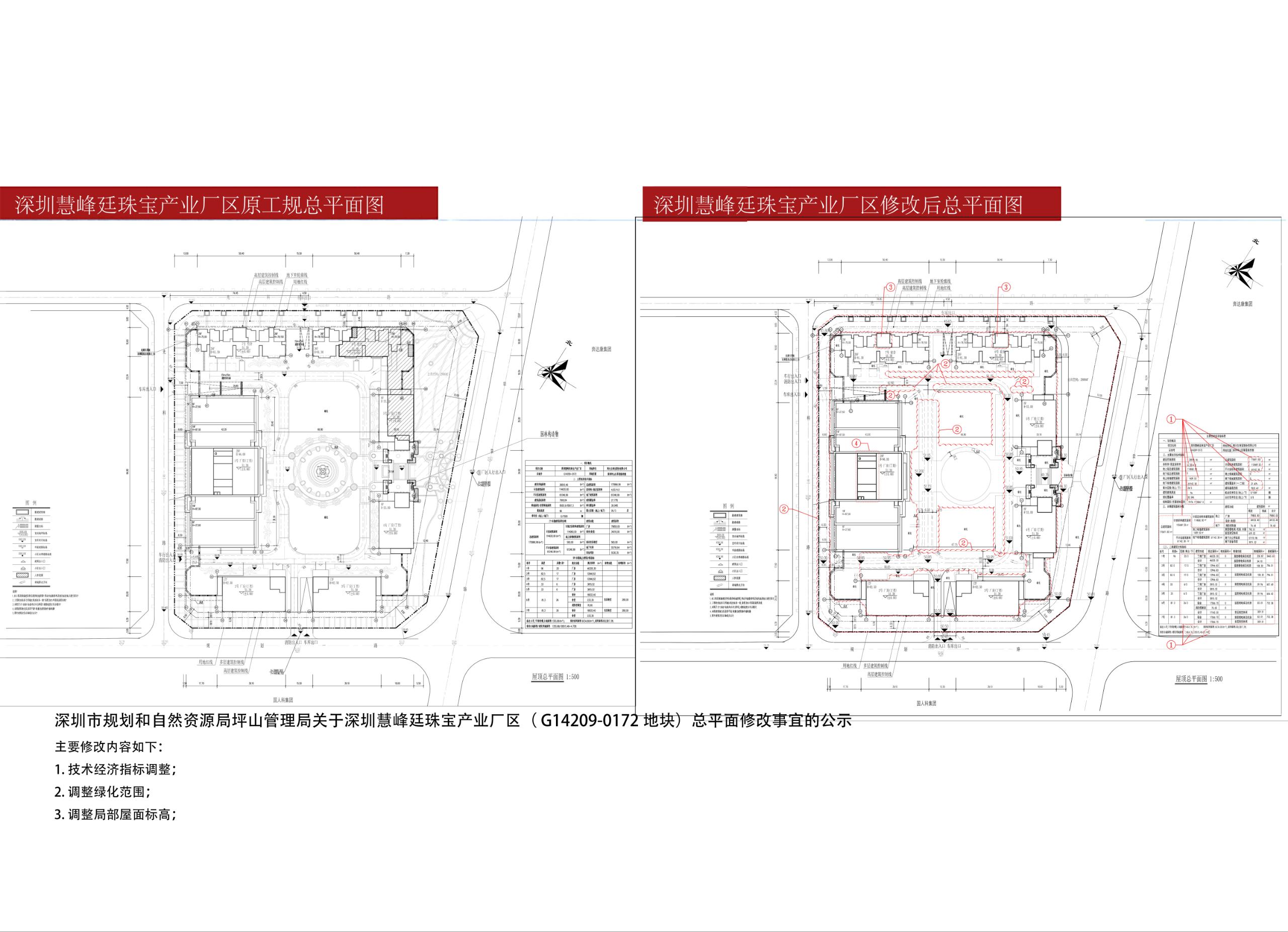 周大生珠宝股份有限公司开发建设的“深圳慧峰廷珠宝产业厂区”项目(宗地号:G14209-0172)位于坪山区龙田街道翠景路与规划一路交汇处西南角,用地面积为28515.46平方米。该项目于2017年10月16日取得《建设工程规划许可证》(深规土建许字PS-2017-0039号)。现由于项目设计优化,总平面图及主要技术经济指标需进行调整,根据《中华人民共和国行政许可法》《中华人民共和国城乡规划法》和《深圳市城市规划条例》等有关规定,现将具体修改内容予以公示如下: