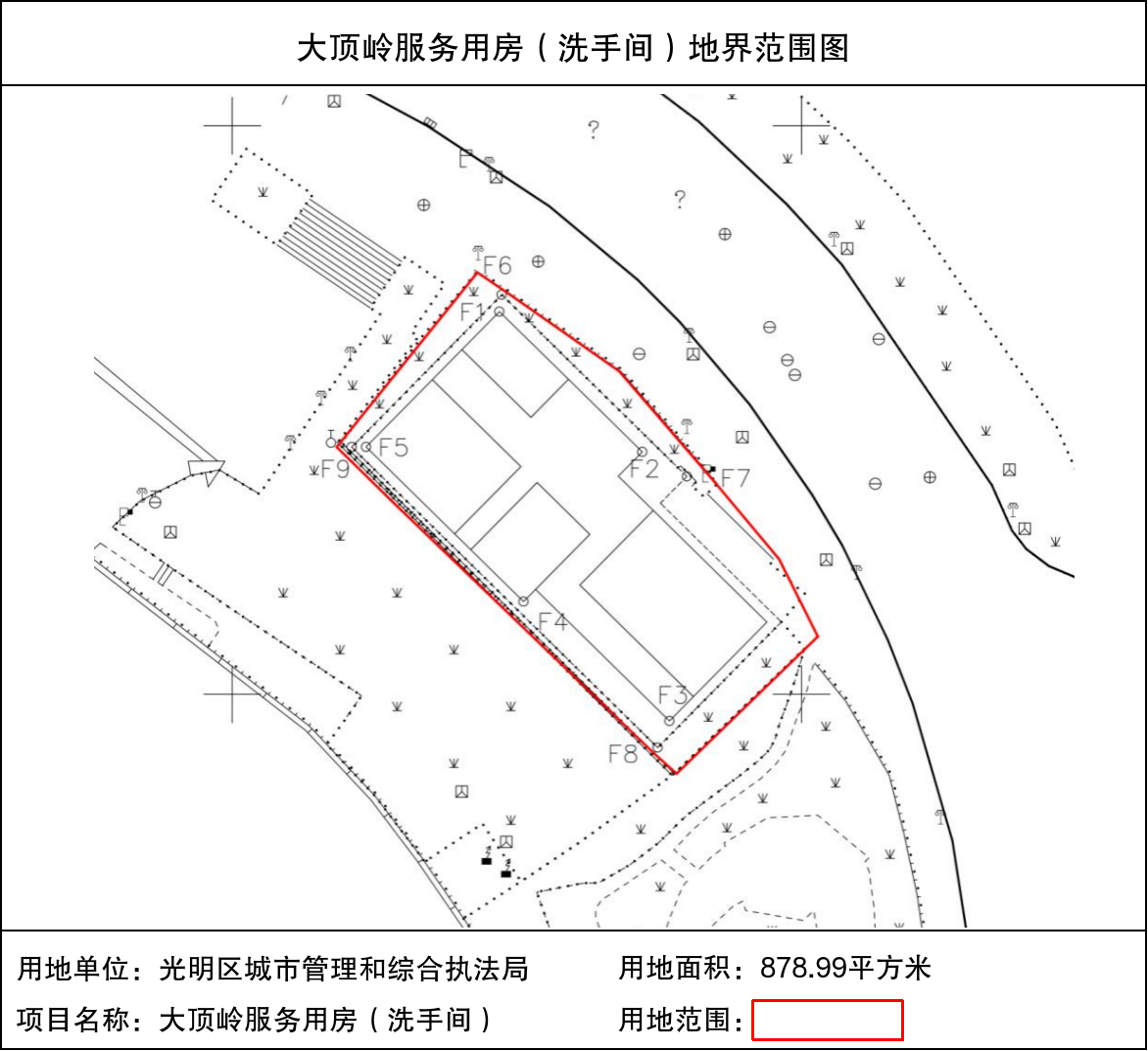 光明区城市管理和综合执法局申请办理大顶岭服务用房(洗手间)房地产登记历史遗留问题土地权属事宜,现将光明区城市管理和综合执法局提供的物业用地范围进行公示,后续我局将结合公示等相关情况开展土地确权工作。上述物业位于深圳市光明区光明街道回归路西侧,物业土地面积共计878.99平方米(最终面积以土地权属证明文件为准),土地使用权人为光明区城市管理和综合执法局,权属来源为行政划拨,现根据《深圳市国有建设用地不动产登记历史遗留问题处理规定》有关规定予以公示: