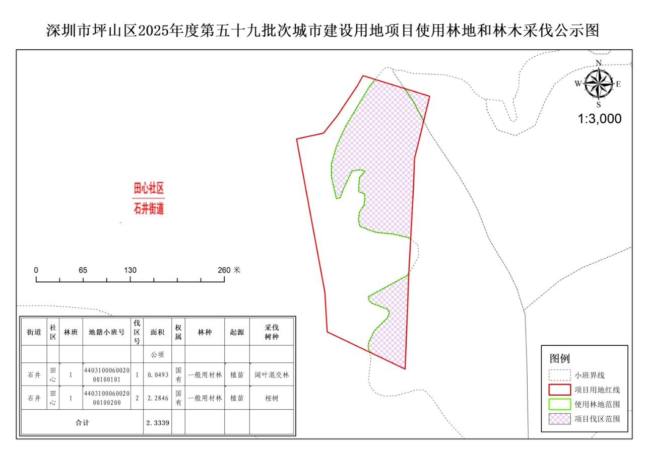 根据《中华人民共和国森林法》《广东省林业局关于林木采伐的管理办法》等法律法规,按照公开、公正、公平的原则,我局对深圳市坪山区2025年度第五十九批次城市建设用地工程拟永久使用林地及林木采伐有关情况公示如下: