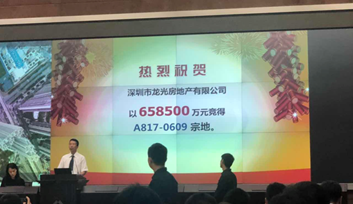 2019年6月24日下午,龙华区民治街道A817-0609宗地在深圳市土地房产交易中心以挂牌方式成功出让。挂牌起始价为45.41亿元,共有11家企业参与竞拍。竞拍现场激烈,经过72轮竞价、97轮竞人才房面积,最终由深圳市龙光房地产有限公司以人民币65.85亿元,配建36700平方米人才房摘得。
