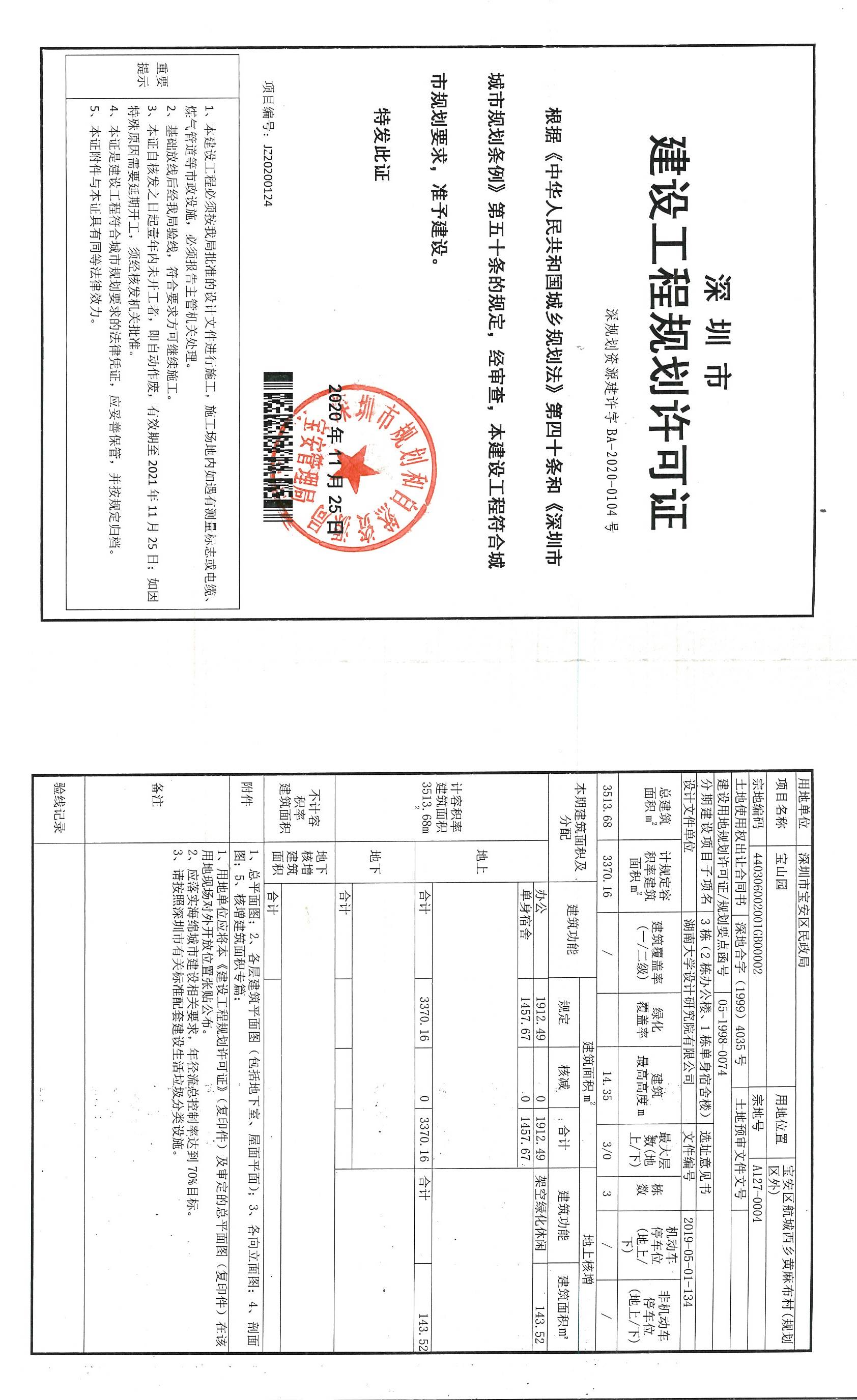 经我局审查,同意核发该项目《建设工程规划许可证》(深规划资源建许字BA-2020-0104号)。根据《中华人民共和国城乡规划法》第四十条的规定,现将本次核发的《建设工程规划许可证》及总平面图予以公布。