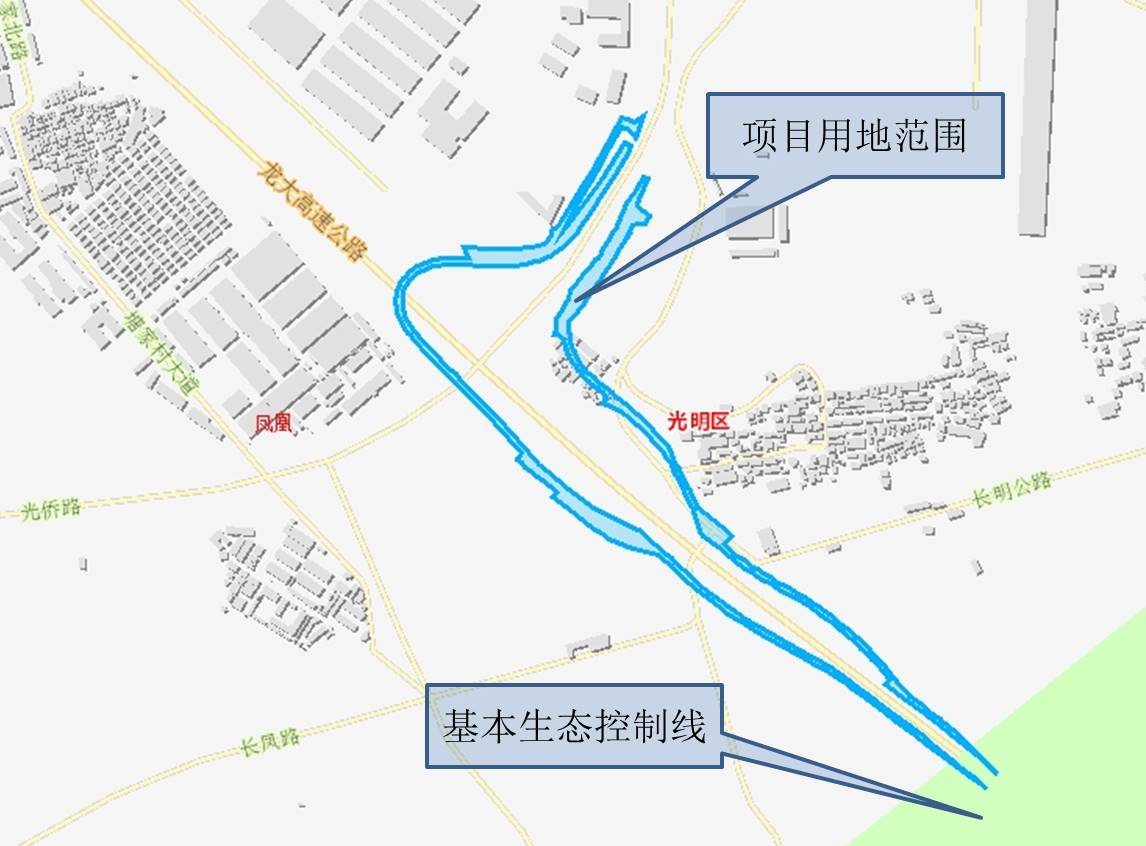 龙大高速市政化改造工程先行开工段(光侨立交2条匝道)位于光明区凤凰街道,用地面积约46748.3平方米。该项目涉及深圳市基本生态控制线范围(示意图见附件)。现按照《深圳市基本生态控制线管理规定》予以公示:
