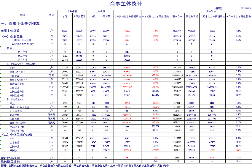 2019年9月份商事主体统计报表