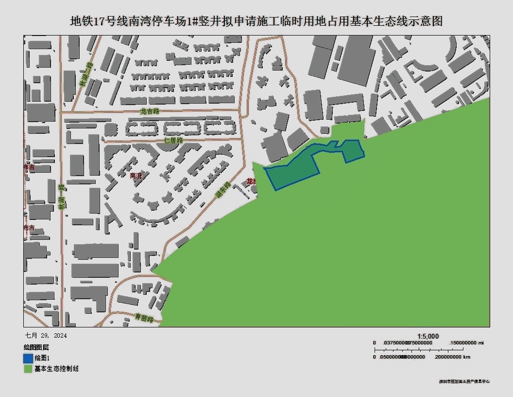 地铁17号线南湾停车场1#竖井拟选址施工临时用地全部位于深圳市基本生态控制线内,面积约12515㎡,拟申请占用4年。具体情况见附图。