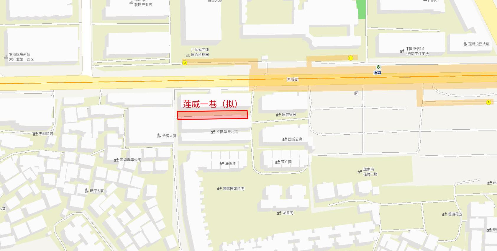 拟命名通道位于罗湖区莲塘街道莲威路与莲馨园之间,长度62.6米,宽度7.3米,坐标起点为X=2496547.725,Y=517265.750,坐标终点为X=2496548.794,Y=517328.406。命名方案为“莲威一巷”。