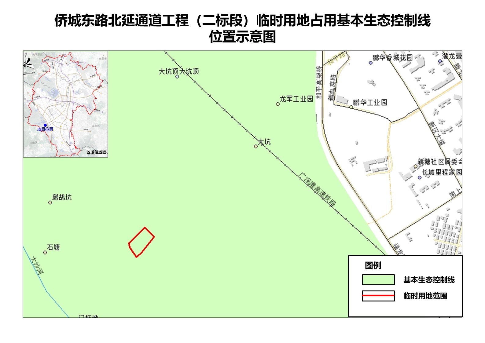 深圳市交通公用设施建设中心申请办理侨城东路北延通道工程(二标段)临时用地审批手续。该临时用地位于大浪街道部九窝东侧,拟作为临时施工材料堆场,用地面积10009平方米,使用期限4年,全部位于基本生态控制线范围内。