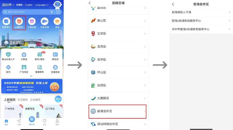 二、进入“i深圳”app。点击“办事预约”,选择“前海合作区”,进入前海办事大厅选择界面。