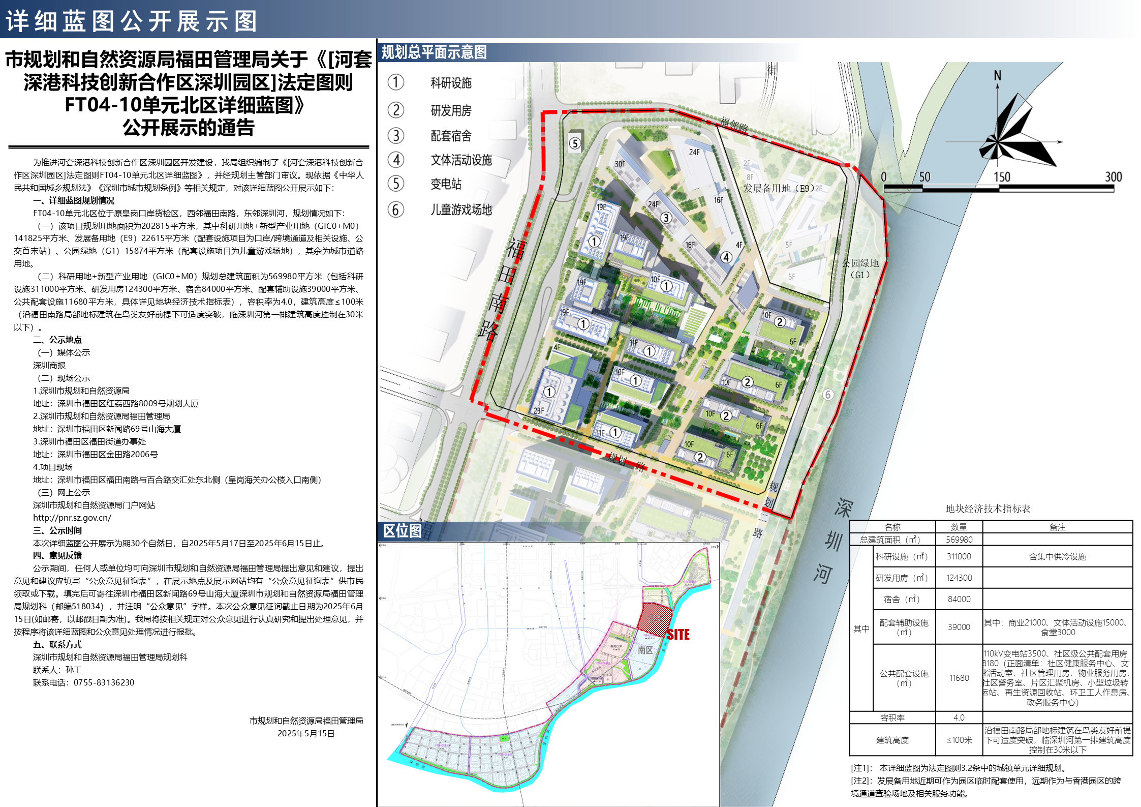 为推进河套深港科技创新合作区深圳园区开发建设,我局组织编制了《[河套深港科技创新合作区深圳园区]法定图则FT04-10单元北区详细蓝图》,并经规划主管部门审议。现依据《中华人民共和国城乡规划法》《深圳市城市规划条例》等相关规定,对项目详细蓝图公开展示如下: