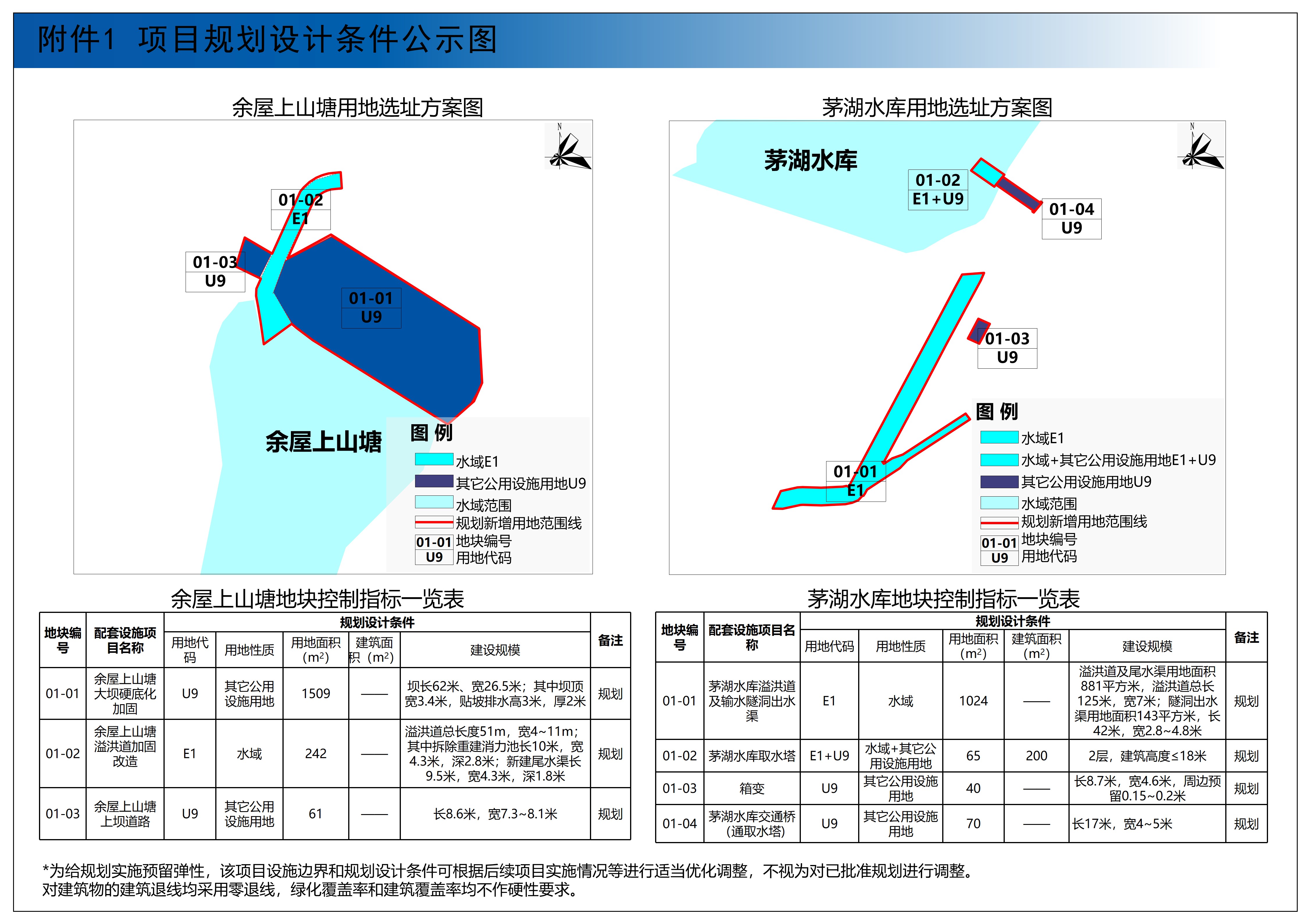 本次规划设计条件涉及余屋上山塘和茅湖水库2座的除险加固配建设施。