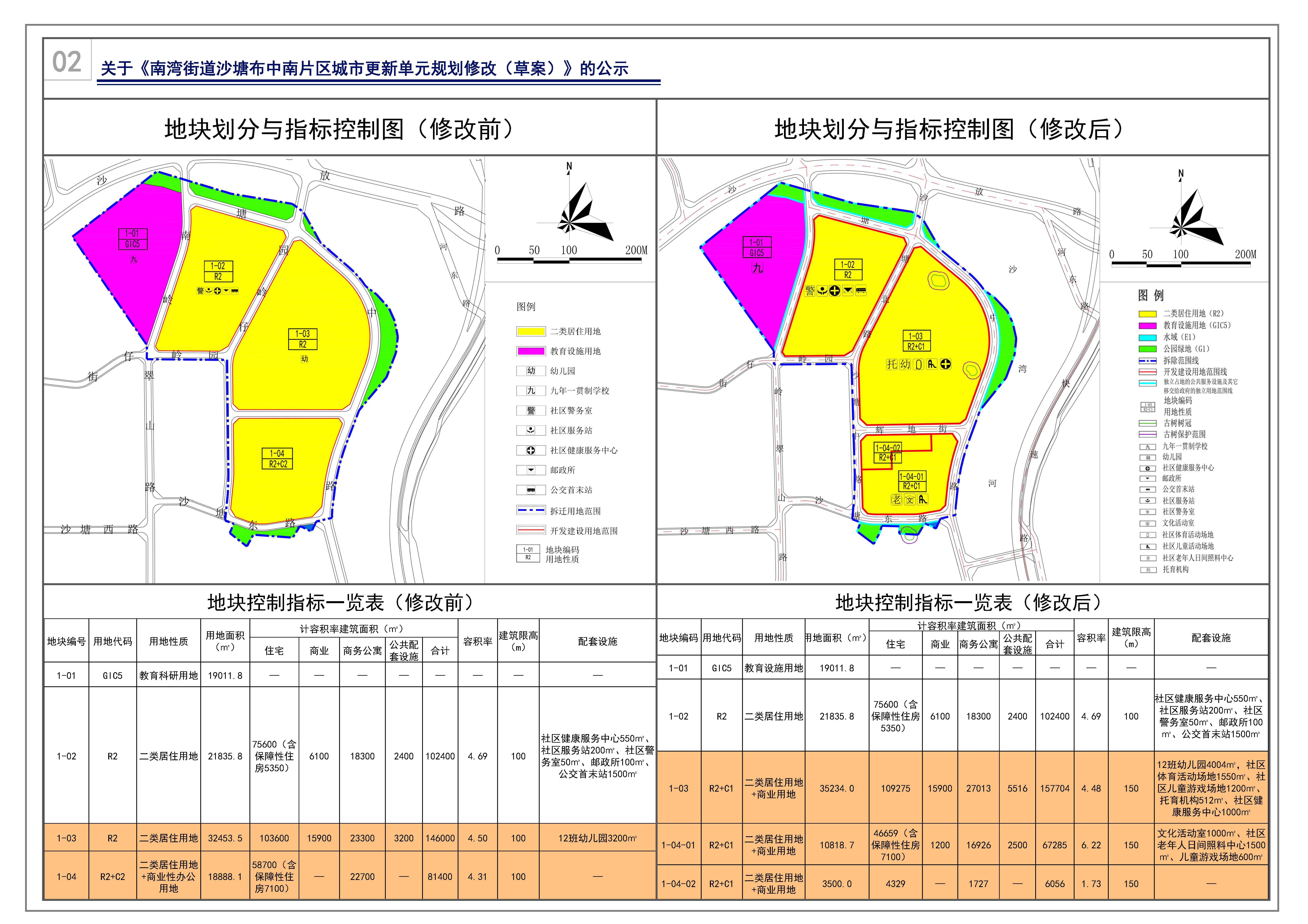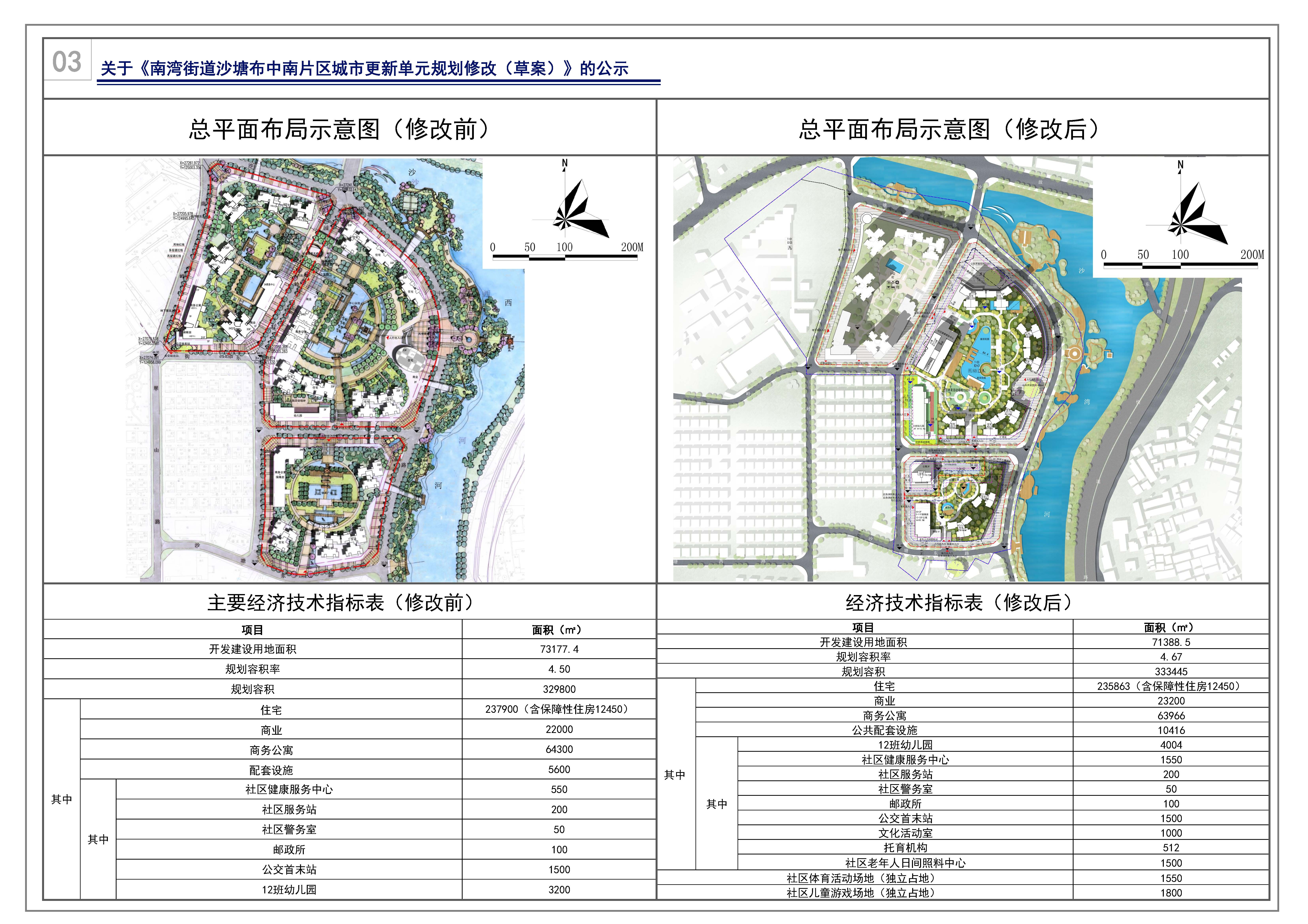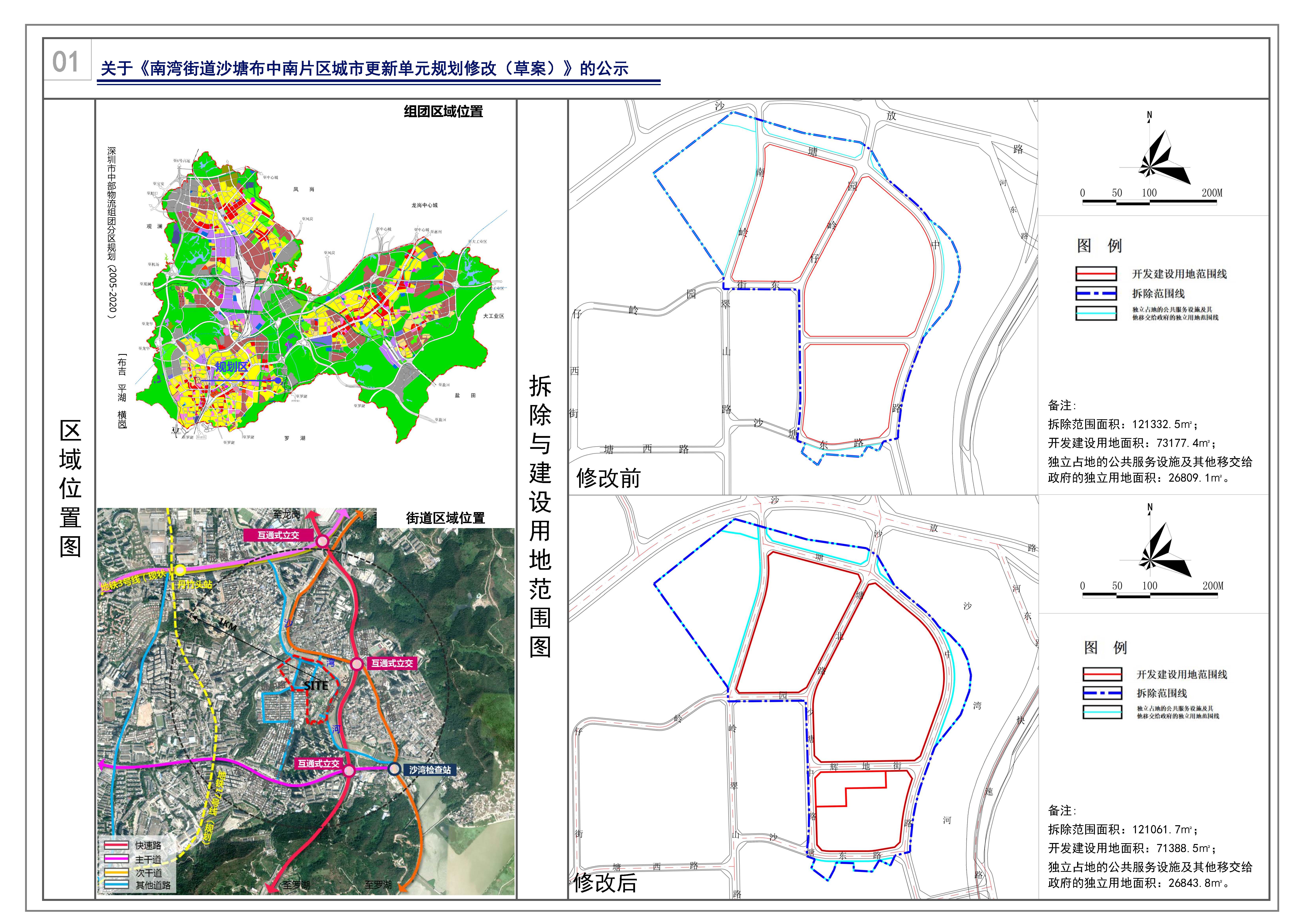 南湾街道沙塘布中南片区城市更新单元2008年被列入《深圳市近期建设规划2008年度实施计划》,后被转入2010年深圳市城市更新单元规划制定计划,该更新单元规划于2011年4月获批,并于2011年7月进行规划修改。2023年11月沙塘布中南片区计划调整经《2021年龙岗区城市更新单元计划第二批计划的补充公告》及区政府批准备案,拆除范围由原121333平方米减少至121062平方米,现申报主体南湾街道办来文申请修改单元规划,该更新单元规划修改事宜已经我局审议通过。根据《中华人民共和国城乡规划法》《深圳经济特区城市更新条例》《深圳市城市更新办法实施细则》《深圳市拆除重建类城市更新单元规划审批规定》等相关规定,现将规划修改事项予以公示,具体如下: