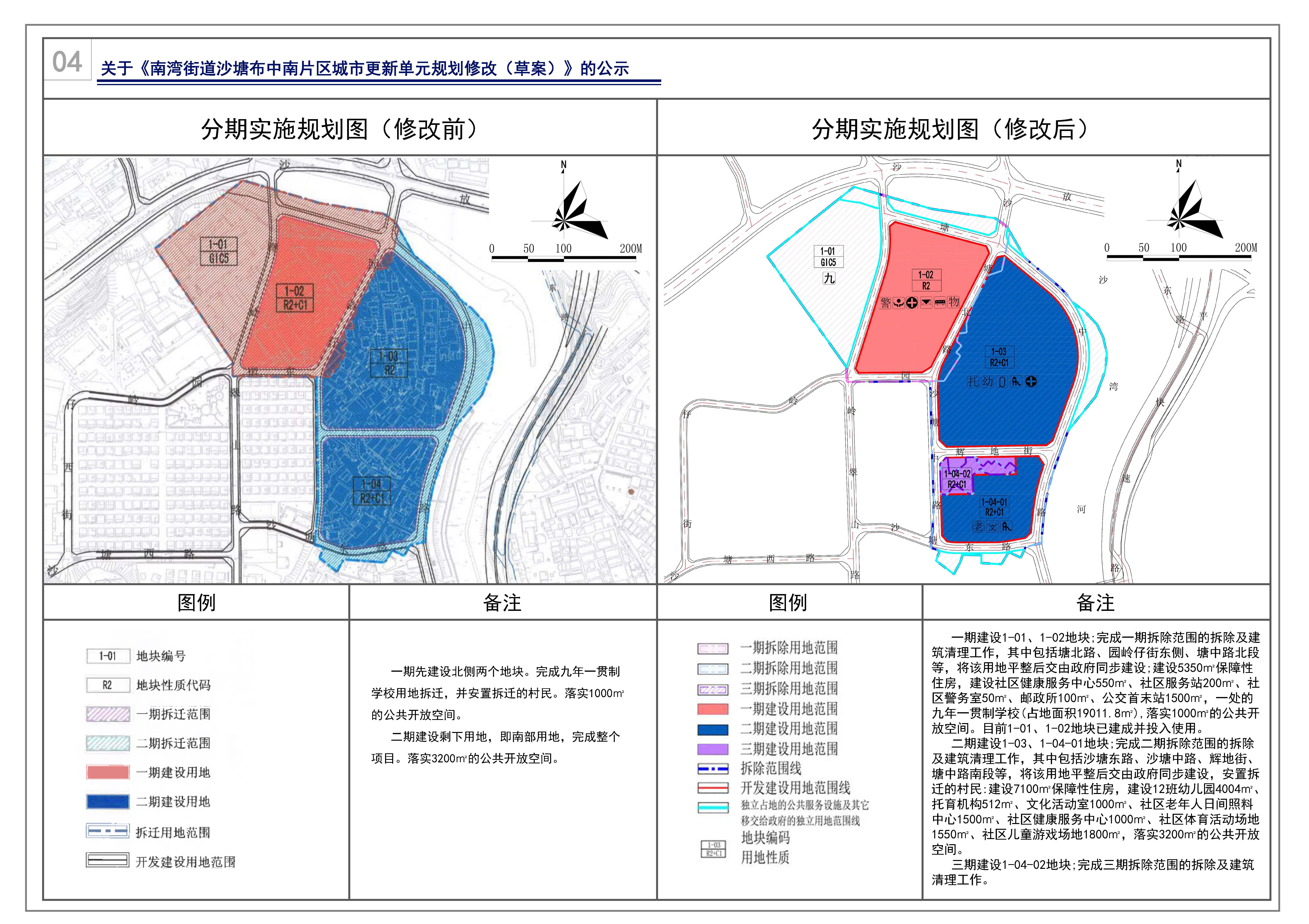 将1-04地块拆分为1-04-01和1-04-02地块,其中1-04-01地块与1-03地块作为二期实施,1-04-02地块作为三期实施,修改后公共利益均于二期落实,且三期净拆建比不低于二期。
