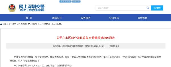 深圳交警发布通告,自2026年4月9日至2027年4月8日在市区部分片区道路实施交通管理措施,涉罗湖口岸、福田口岸等区域。